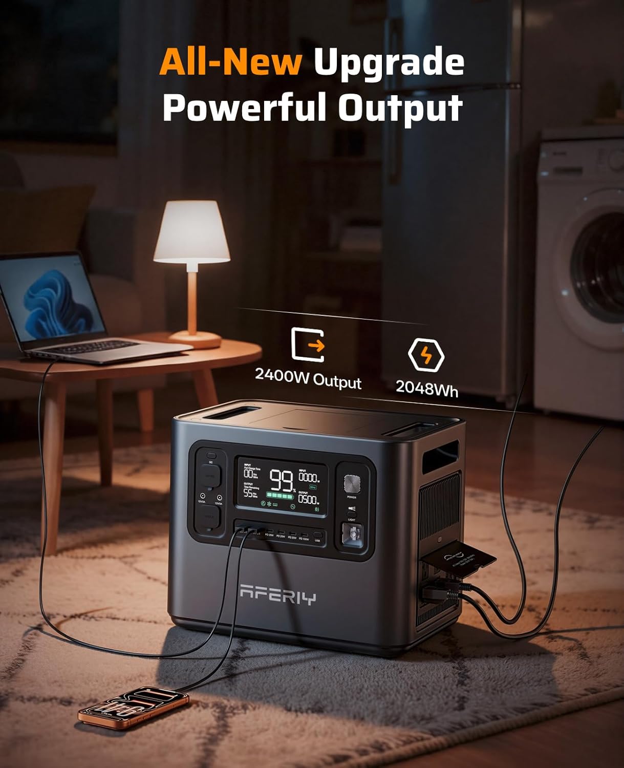 The AFERIY 2048Wh Portable Power Station is designed for versatility and convenience, making it ideal for various uses such as camping, home backup, and during power outages. With a peak output of 4800W and a continuous output of 2400W, it can handle multiple devices simultaneously.