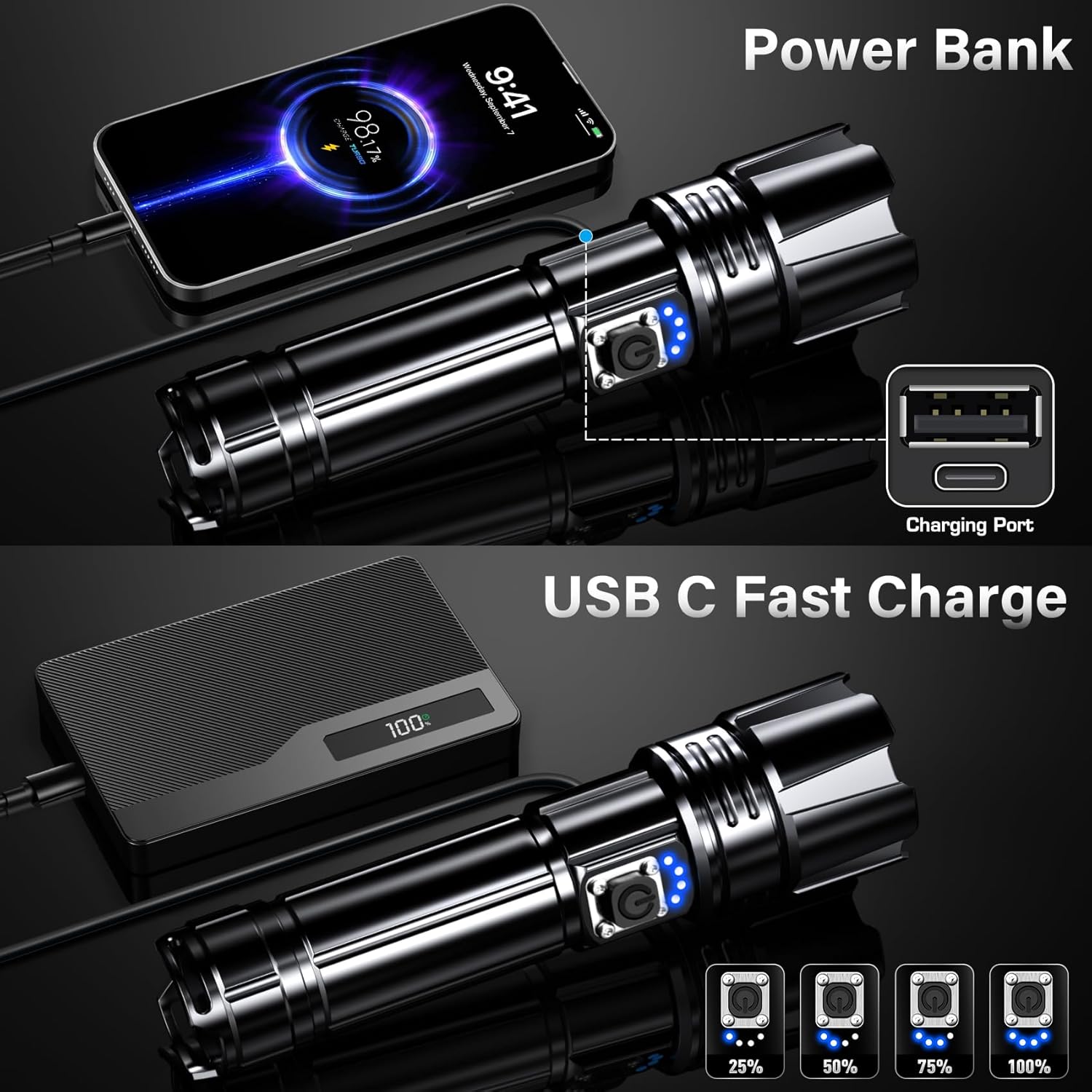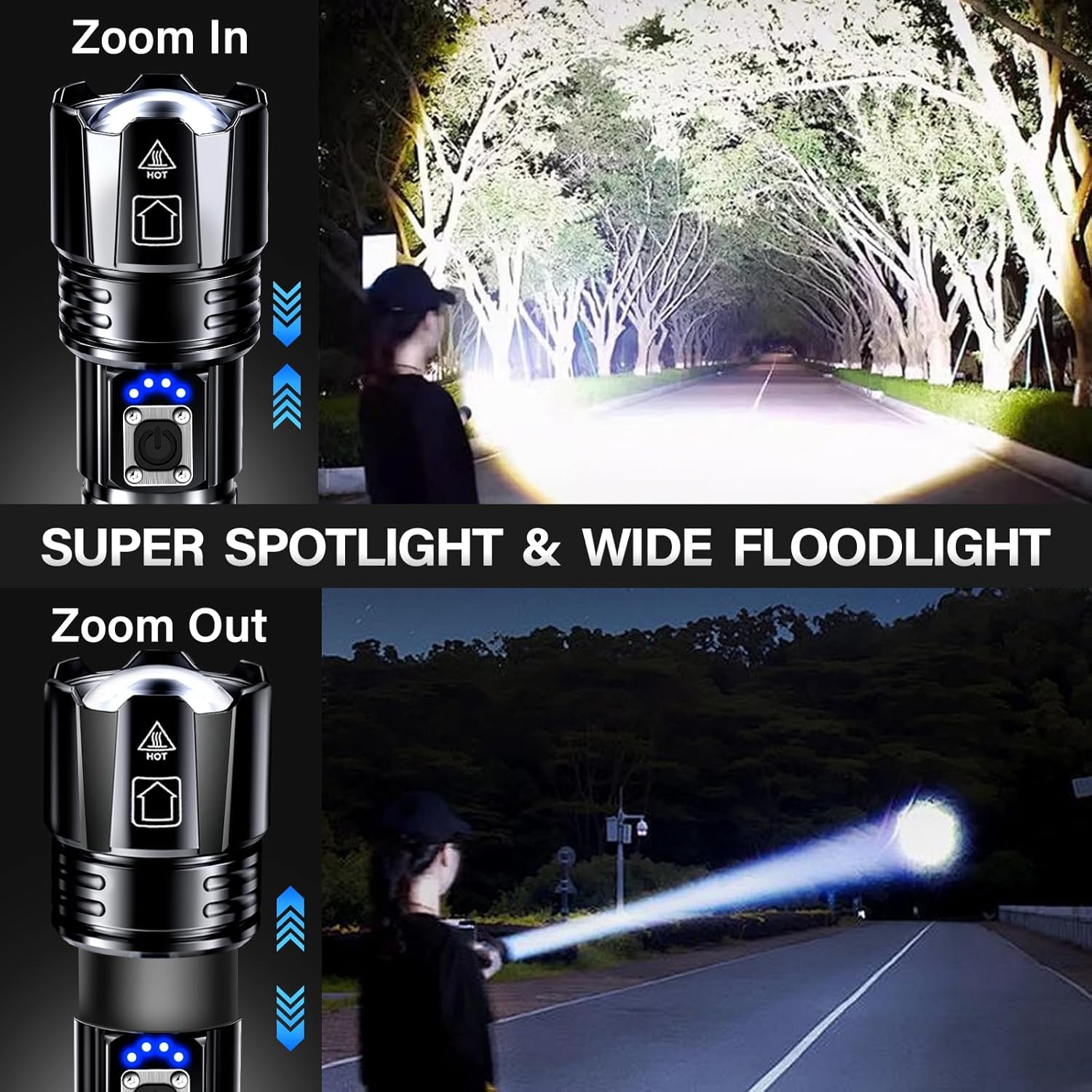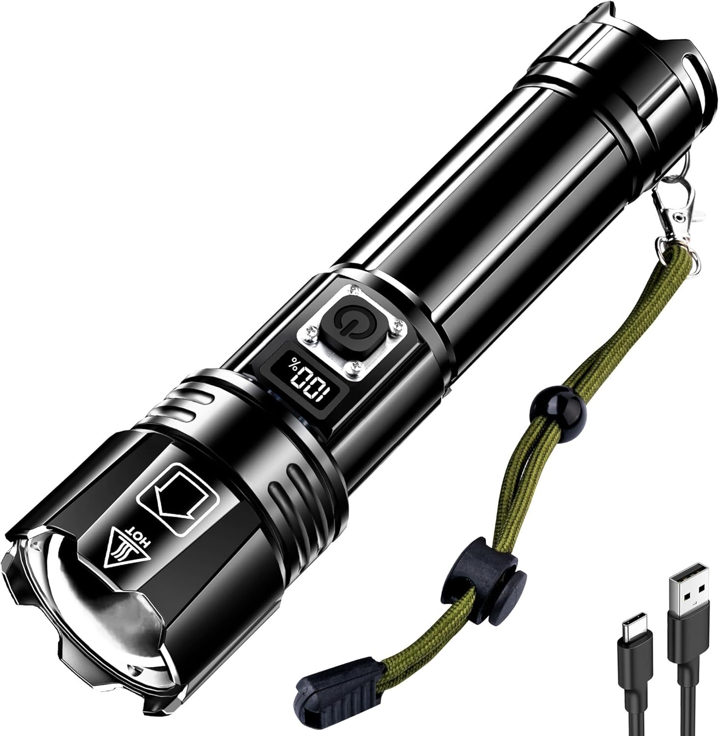 The AKNEAR Rechargeable LED Flashlight is designed for versatility and reliability. It features an upgraded LED chip that provides an impressive 99000 high lumens, making it ideal for various activities such as home use, hiking, and camping. The flashlight offers both spotlight and floodlight modes, allowing you to adjust the beam according to your needs. With a USB-C rechargeable battery, you can easily power up the flashlight, ensuring it’s always ready when you need it.