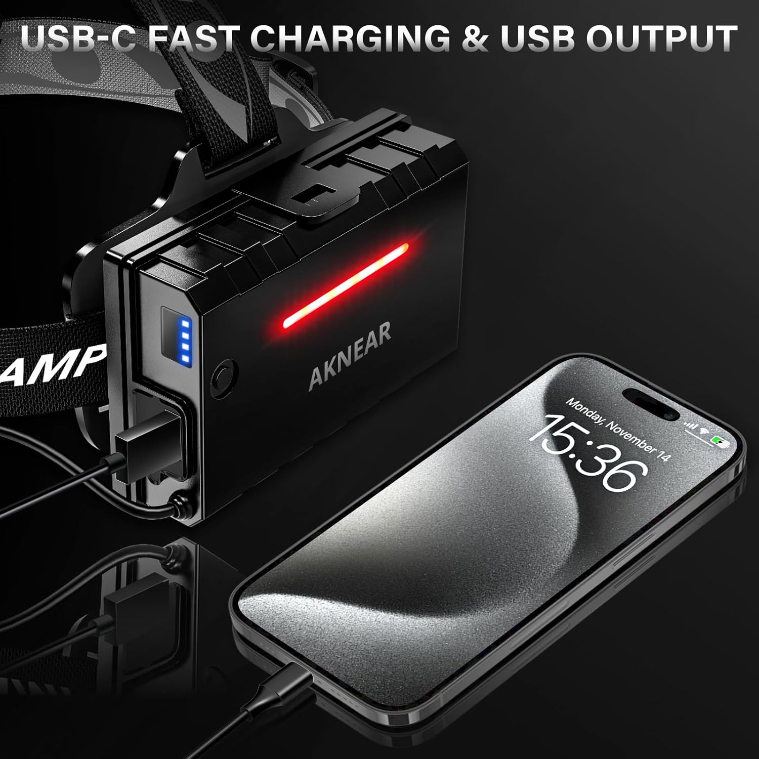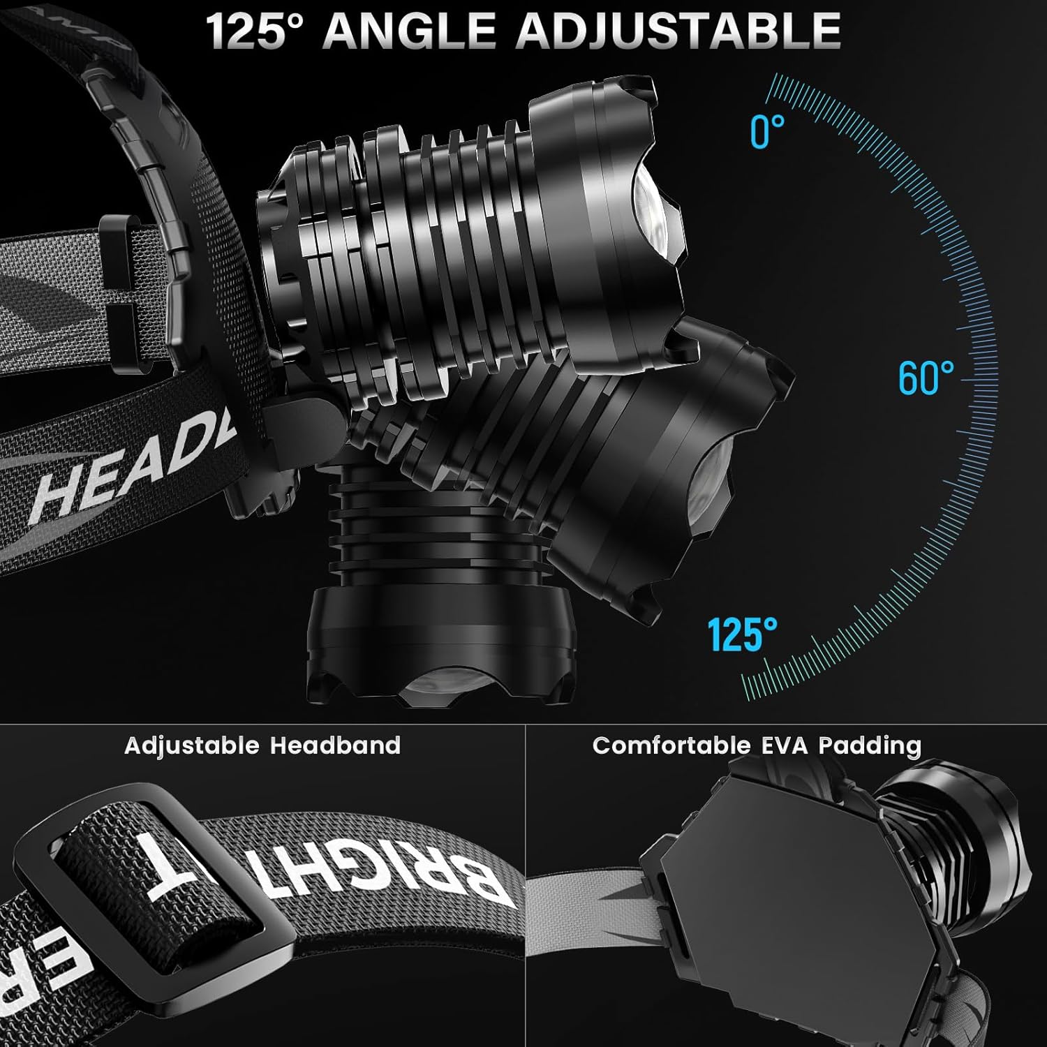 AKNEAR Rechargeable LED Headlamp Super Bright, 99000 High Lumens Head Lamp Zoomable, 25Dys+ Runtime & 12 Mode & Lightweight Comfort & 125° Adjustable IPX-7 Waterproof Head Light for Outdoor,Hardhat
