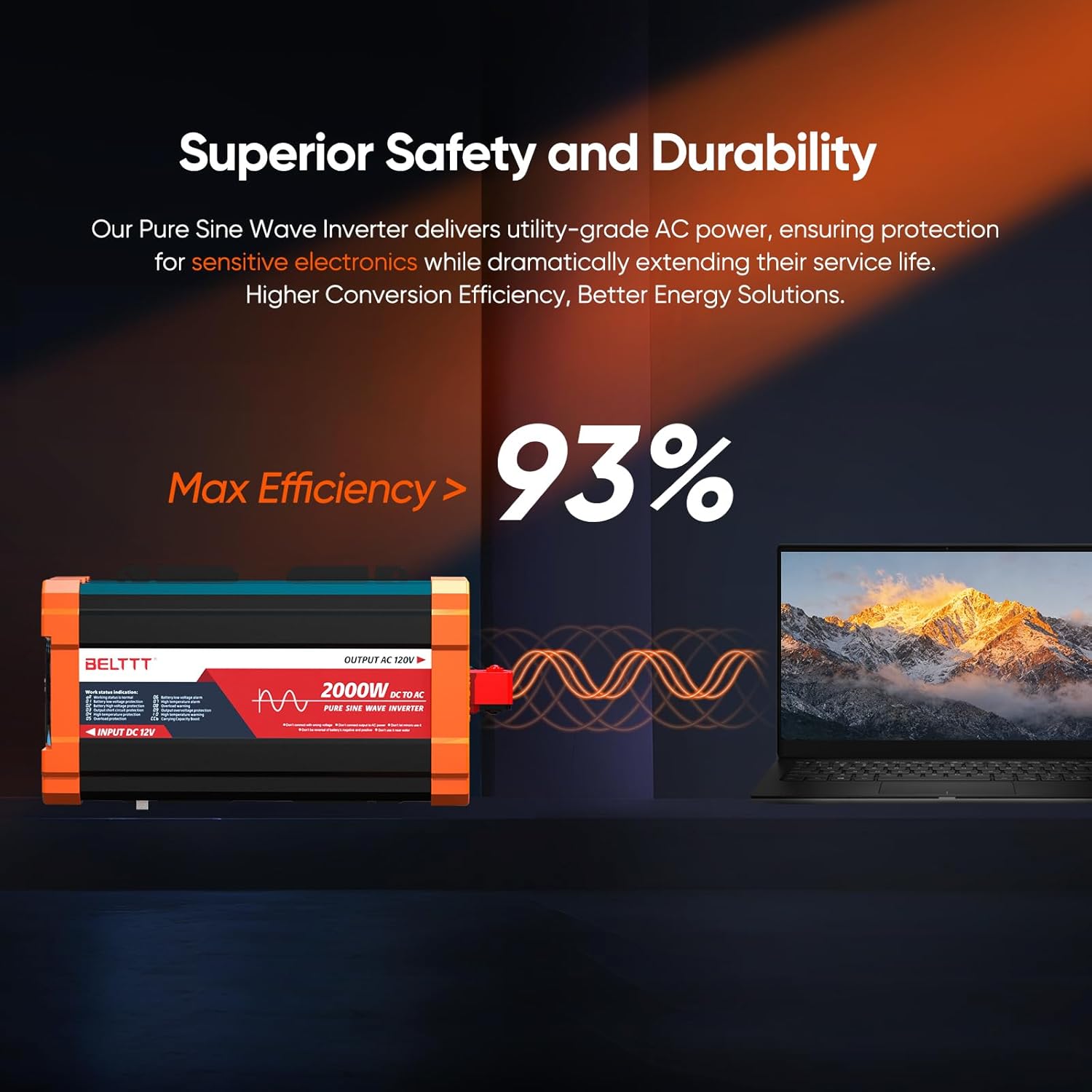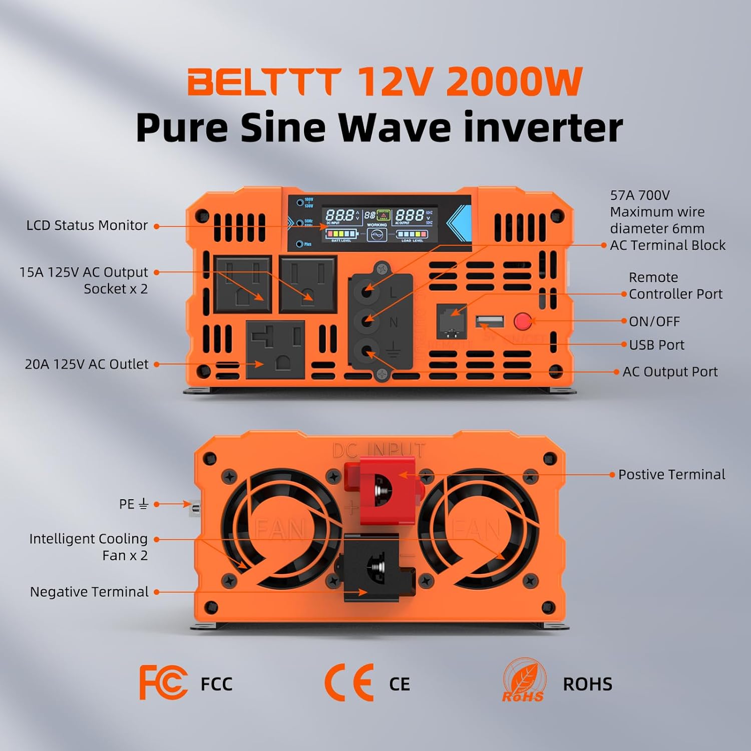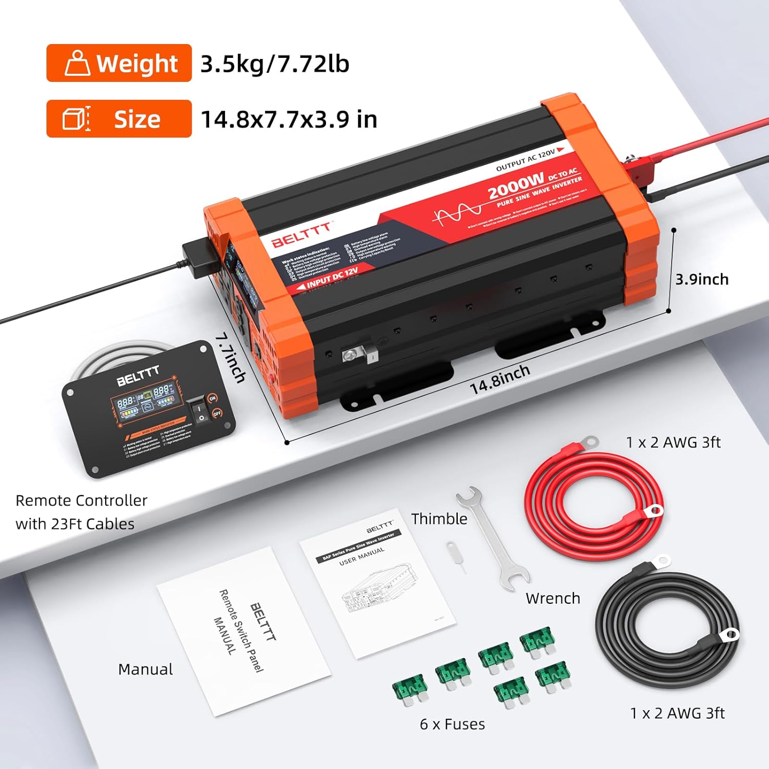 BELTTT 2000W Pure Sine Wave Inverter, Inverter 12V DC to 120V AC for Solar, RV, Truck, Outdoor, Power Inverter with Dual AC and 20A Socket, 5V 2.1A USB, Surge 4000W, Hardwire Port, Remote Controller