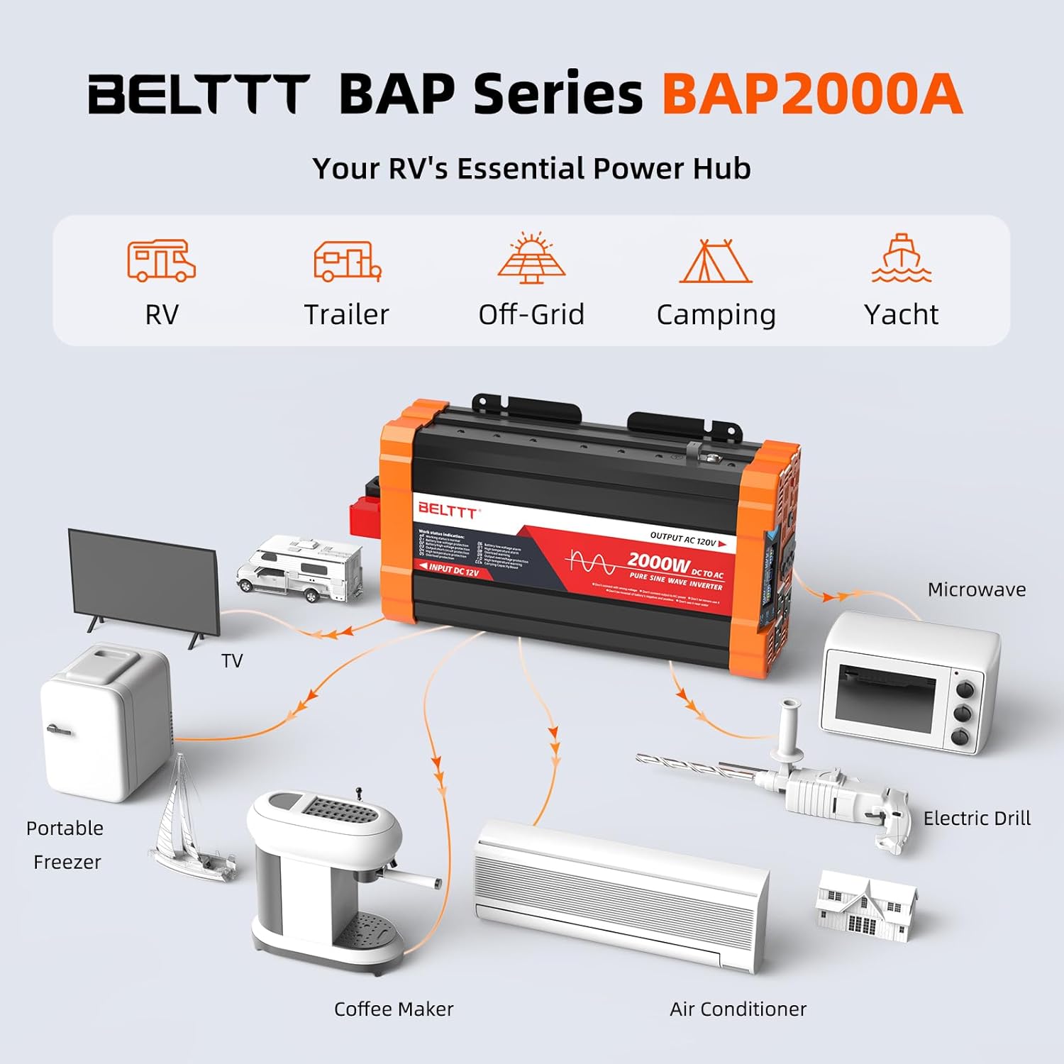 The BELTTT 2000W Pure Sine Wave Inverter is designed for various applications, including solar setups, RVs, and outdoor use. This inverter converts 12V DC to 120V AC, making it versatile for powering different devices. It features dual AC outlets and a 20A socket, allowing multiple devices to be connected simultaneously. Additionally, the 5V 2.1A USB port is perfect for charging mobile devices. With a surge capacity of 4000W, this inverter can handle high startup loads.