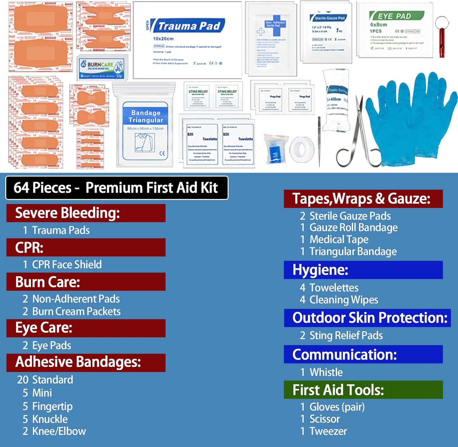 - Includes 64 essential medical supplies