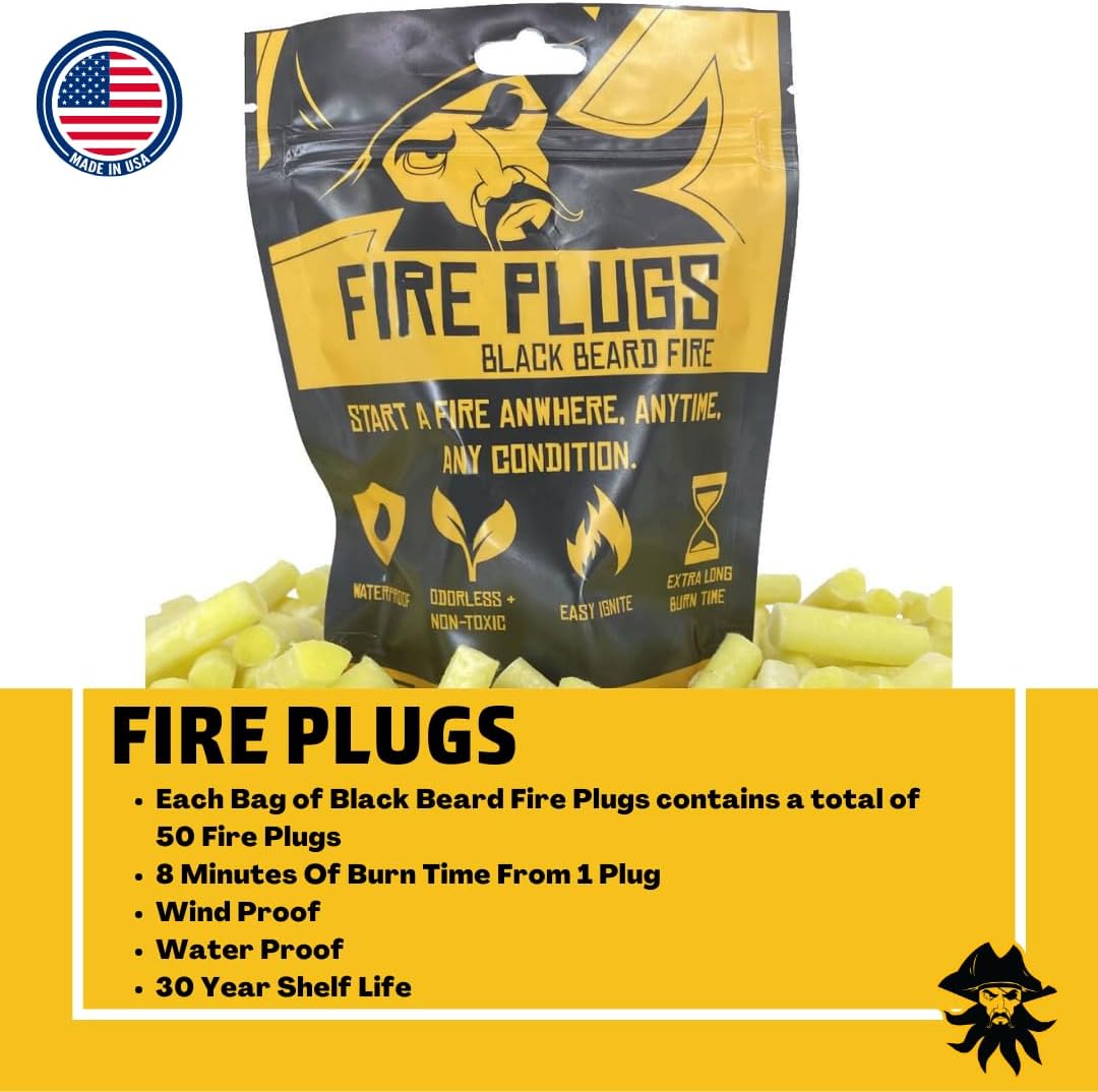 Black Beard Fire Plugs are designed to make starting a fire easy and reliable. These weatherproof fire starters can light over 50 fires, making them ideal for various outdoor activities such as camping, backpacking, and BBQs. With an extra long burn time and a shelf life of 30 years, they are perfect for emergency survival kits. Made in the USA, they provide a dependable solution for igniting your adventures.