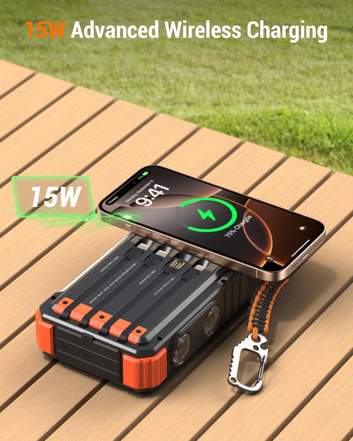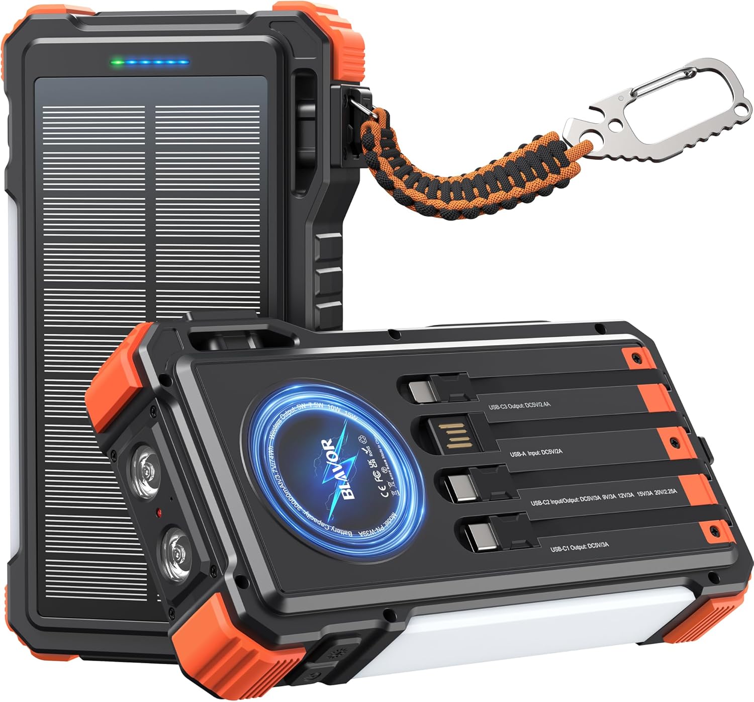 BLAVOR 45W Solar Charger Power Bank 20000mAh Wireless Portable Charger Built-in Cables, PD QC Fast Charging Battery Pack with USB-C for iPhone, Samsung, Dual Flashlight & Carabiner for Camping, Hiking