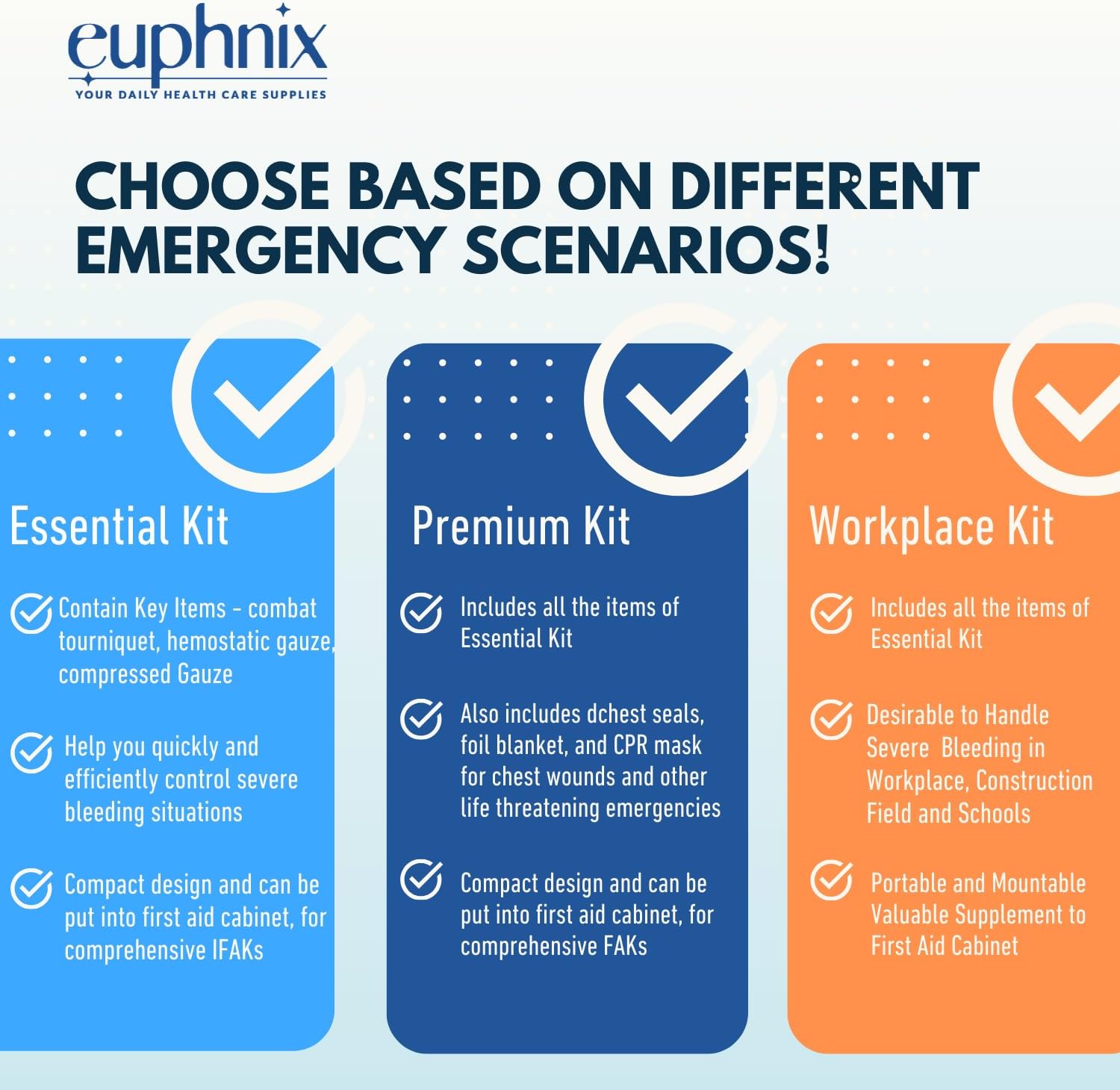 The kit includes 19 essential supplies for hemorrhage and penetrating emergencies, including Quick Clot and other premium items.