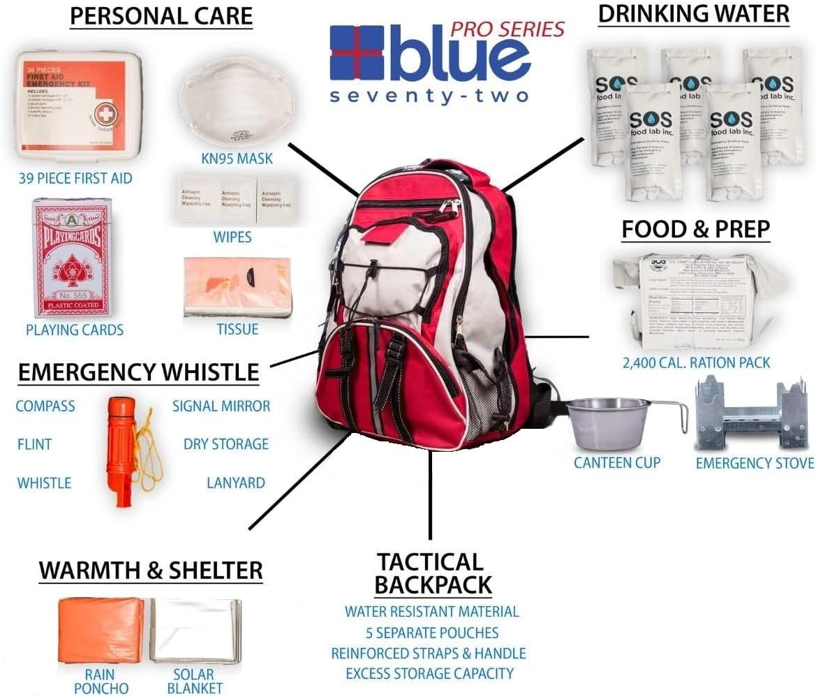 Blue Seventy-Two – Pro Series – Red Deluxe 72 Hour Emergency Backpack Survival Kit for 1 Person | Survival Kits for Emergencies (Includes Water Tablets)