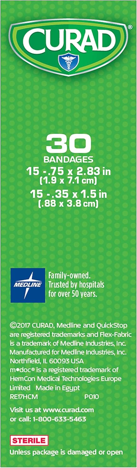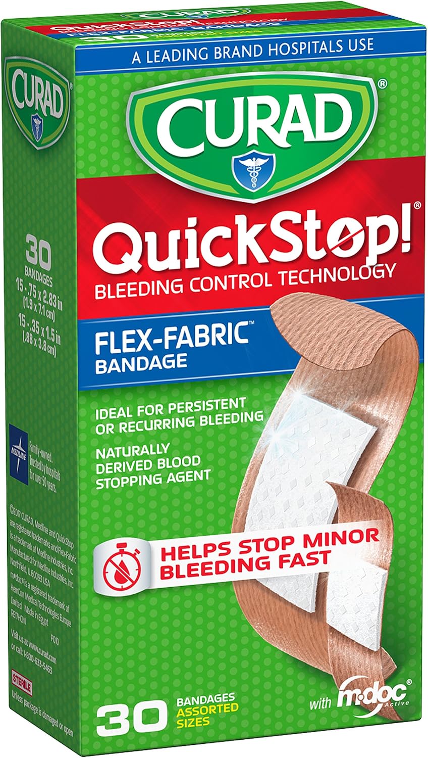 CURAD QuickStop Bleeding Control Flexible Fabric Bandages, Assorted Sizes, 30 Count