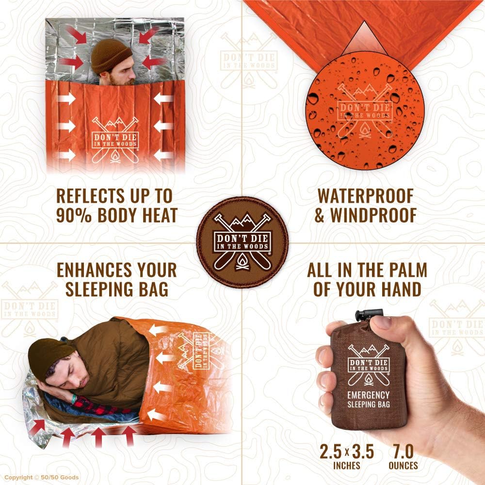 Don’t Die in The Woods – Emergency Sleeping Bag with Hood – Made with Extra Thick Thermal Mylar – 10 Essentials Hiking Camping Blanket, Survival Gear Tactical Car Disaster Bug Out First Aid Kits