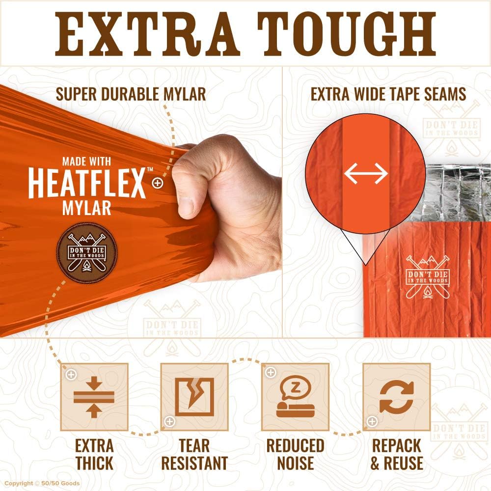 The sleeping bag is made with extra thick HeatFlex mylar, which is tear-resistant and more flexible than ordinary space blanket mylar.