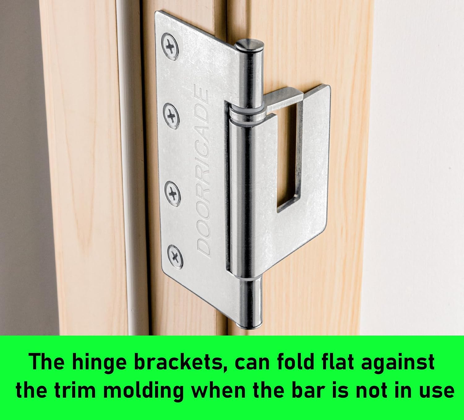 The Doorricade Door Security Bar is designed to enhance the security of your inward opening front door or safe room. Made from premium grade aluminum and featuring stainless steel hinge brackets, it ensures durability and strength. The installation process is straightforward, with hinge brackets that can be easily mounted between the door and the door jamb. Included are eight three-inch screws that are long enough to secure the bar to the wall studs on both sides of the door.