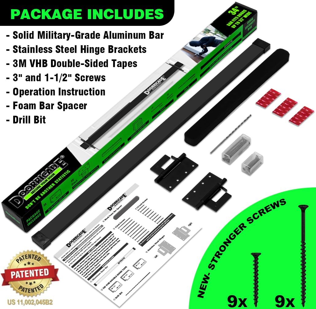 The Doorricade Door Security Bar is designed to enhance the security of your inward opening front door. Constructed from premium grade aluminum and featuring stainless steel hinge brackets, this security bar provides a robust defense against unauthorized entry. Installation is straightforward, with hinge brackets that can be easily mounted between the door and door jamb. The package includes eight three-inch screws, ensuring a secure fit by reaching the wall studs on both sides of the door.