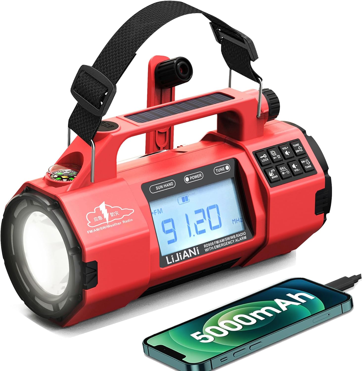 Emergency FM/AM/SW Weather Radio, Big Flashlight/Speaker,Type-C,Sleep Timer Alarm Clock, Solar/Hand Crank Charge, 5000mAh Replaceable Battery,with Cell Phone Charger Hurricane Storm Survival kit