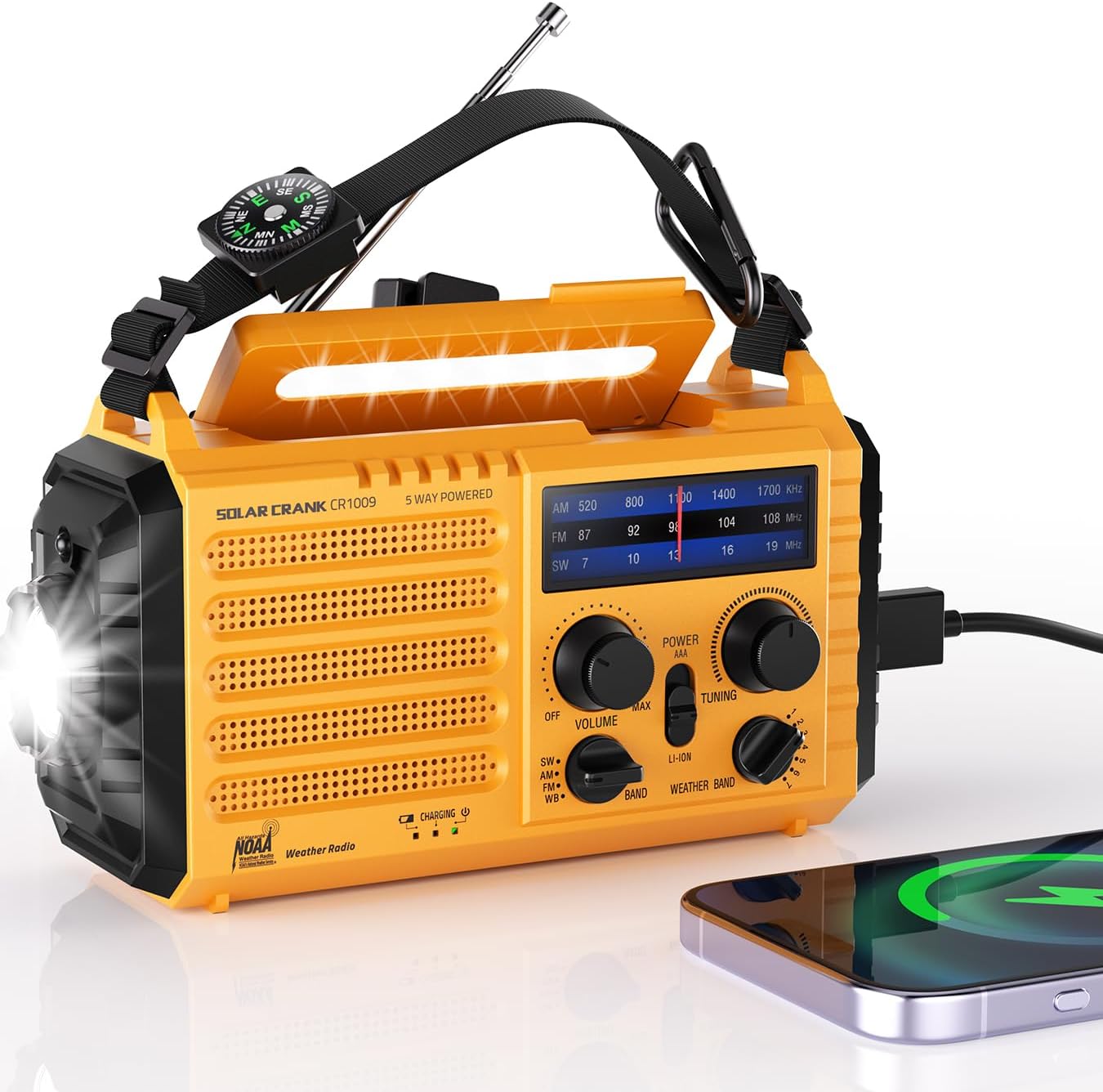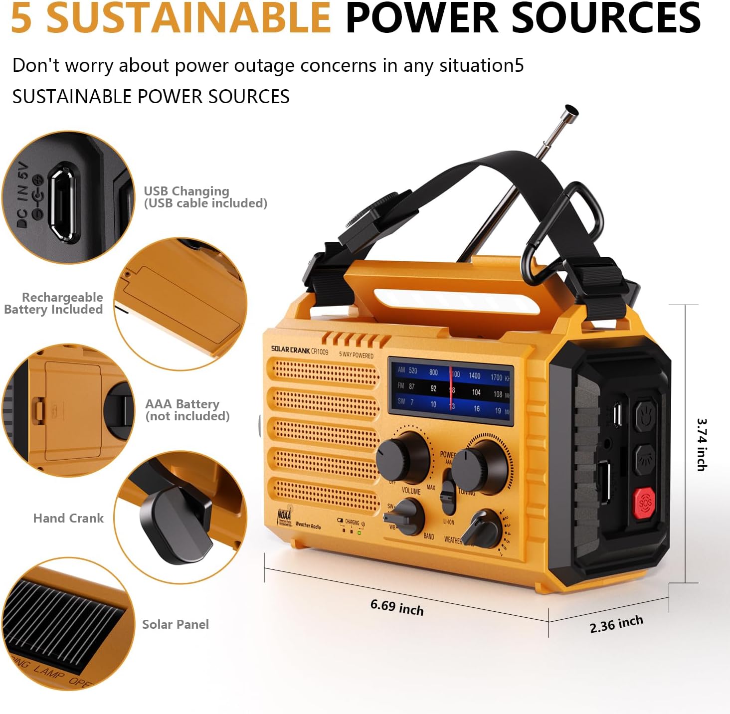 • 5 ways to power: hand crank, solar, battery, USB, and AC
