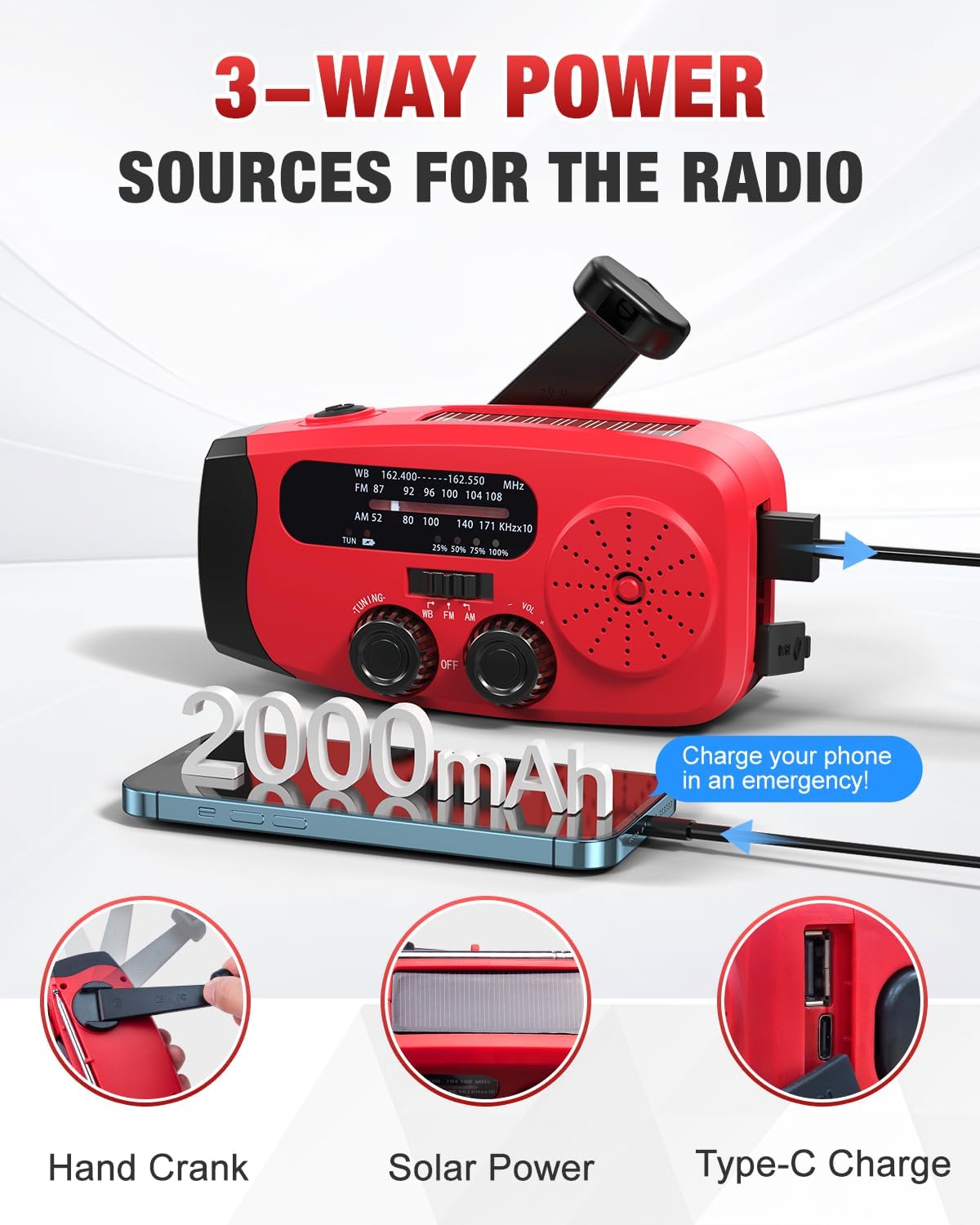 Emgykit 086S Hand Crank Emergency Radio – 2000mAh/7400mWh AM/FM/NOAA Solar Hand Crank Emergency Radio with 3 LED Flashlight, SOS Function for Emergencies, Camping – Red