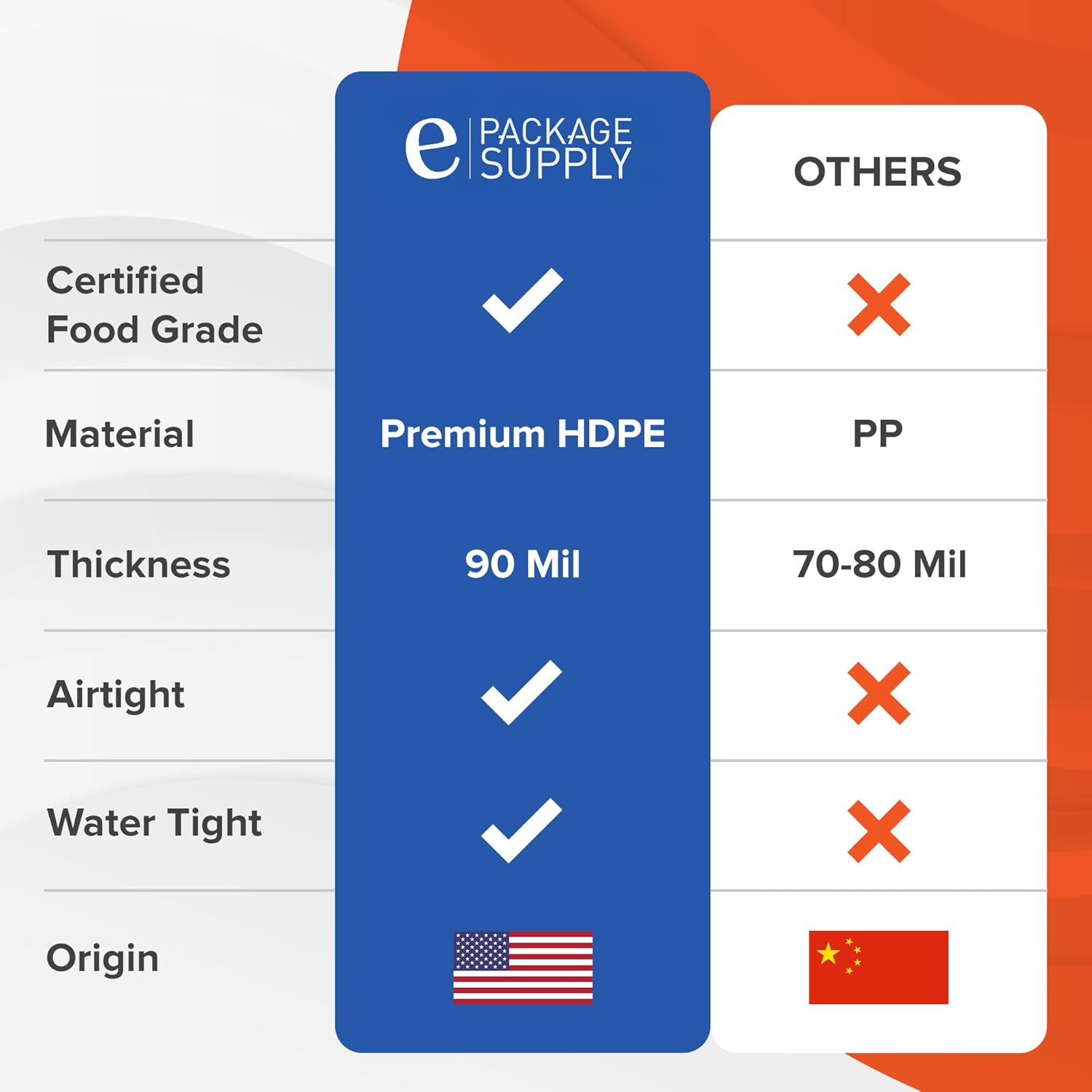 The ePackageSupply 5 Gallon Bucket is designed for long-term food storage, ensuring your supplies remain safe and fresh. Made from heavy-duty 90 mil HDPE plastic, this bucket is both durable and reliable. The airtight Gamma Seal screw-on lid provides an excellent seal, preventing moisture and pests from entering. This product is BPA-free, making it a safe choice for food storage. Each pack includes three buckets, perfect for bulk storage needs.