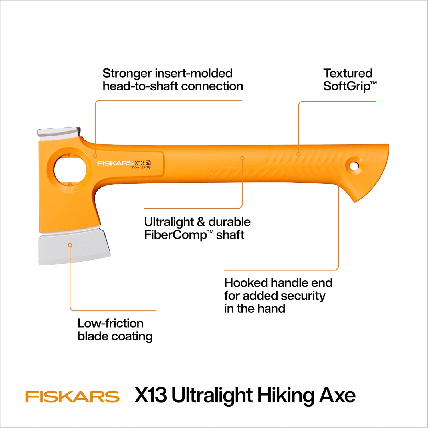 Fiskars X13 Ultralight Hiking Axe 13″, Ultra-Sharp Forged Steel Blade for Efficient Chopping & Camping, 15% Lighter High-Visibility Orange FiberComp Handle Drives Tent Stakes, Sheath Included