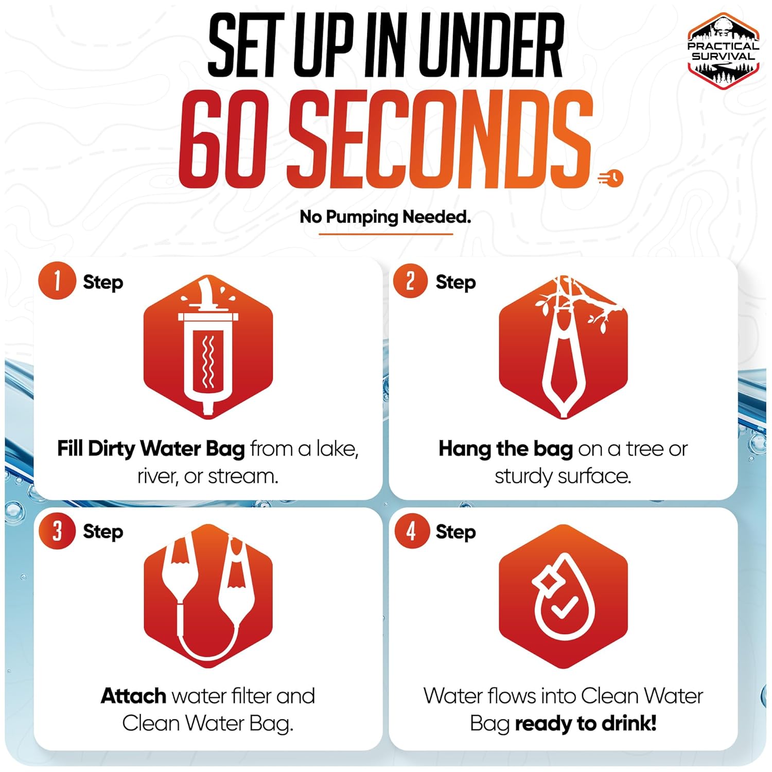 The Gravity Water Filtration System is designed for outdoor enthusiasts who need reliable access to clean water. It includes two high-capacity lightweight hanging bags, making it ideal for backpacking, camping, and hiking. The system effectively filters dirty water, ensuring you have safe drinking water on your adventures.