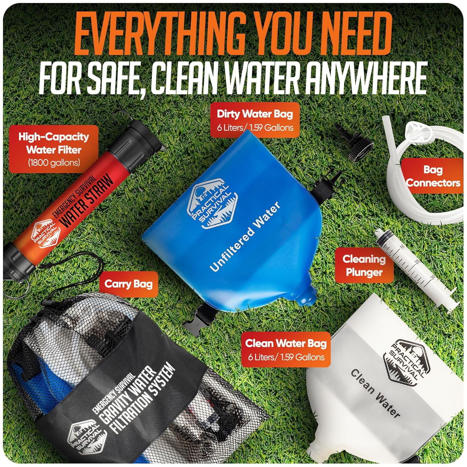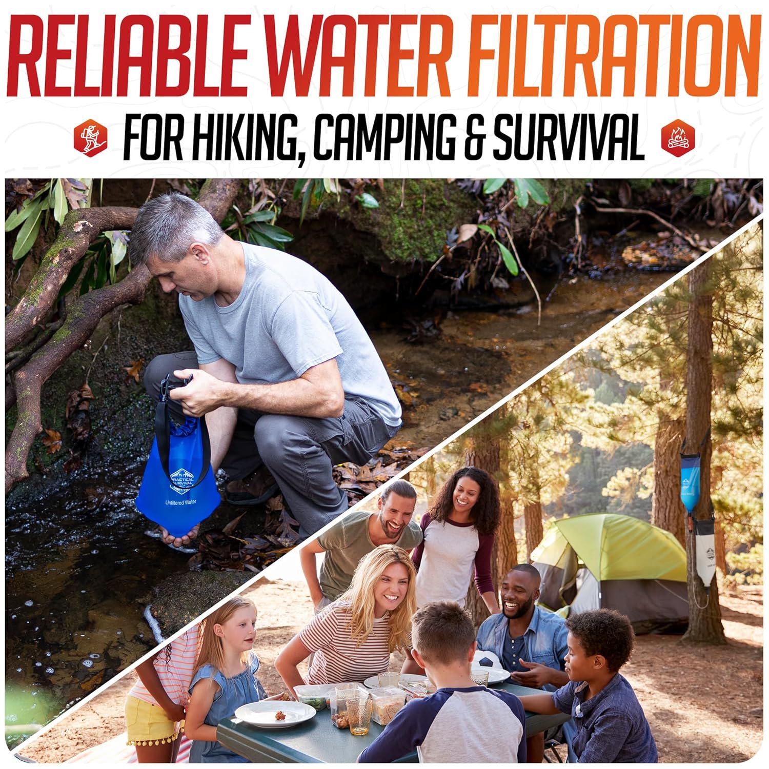 Gravity Water Filtration System – 2 High Capacity Lightweight Hanging Bags for Backpacking, Camping, Survival, Hiking, Hunting – Dirty, Clean Water Bags, Water Filter and Cleaning Plunger Included