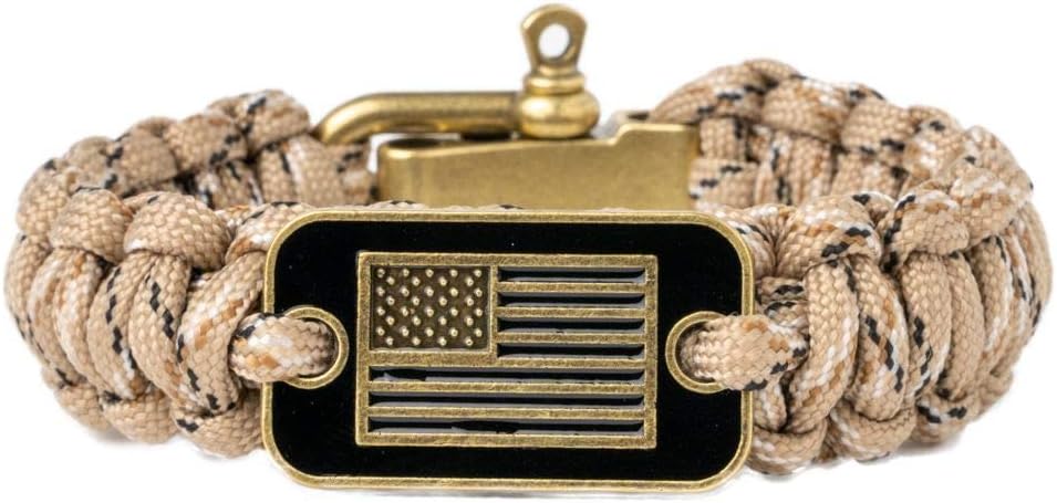 The Hero Company Camo Paracord Bracelet is designed for tactical use and survival situations. Made from durable paracord, this bracelet is both functional and stylish, featuring a bronze USA flag emblem that adds a patriotic touch. It is ideal for outdoor enthusiasts and those who appreciate practical accessories.