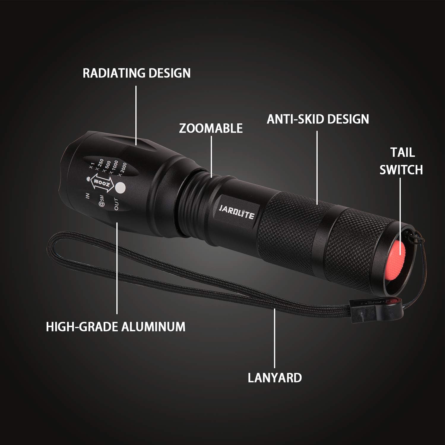 JARDLITE LED Emergency Handheld Flashlight, 4 Pack, Adjustable Focus, Water Resistant with 5 Modes, Best Tactical Torch for Hurricane, Camping, Dog Walking