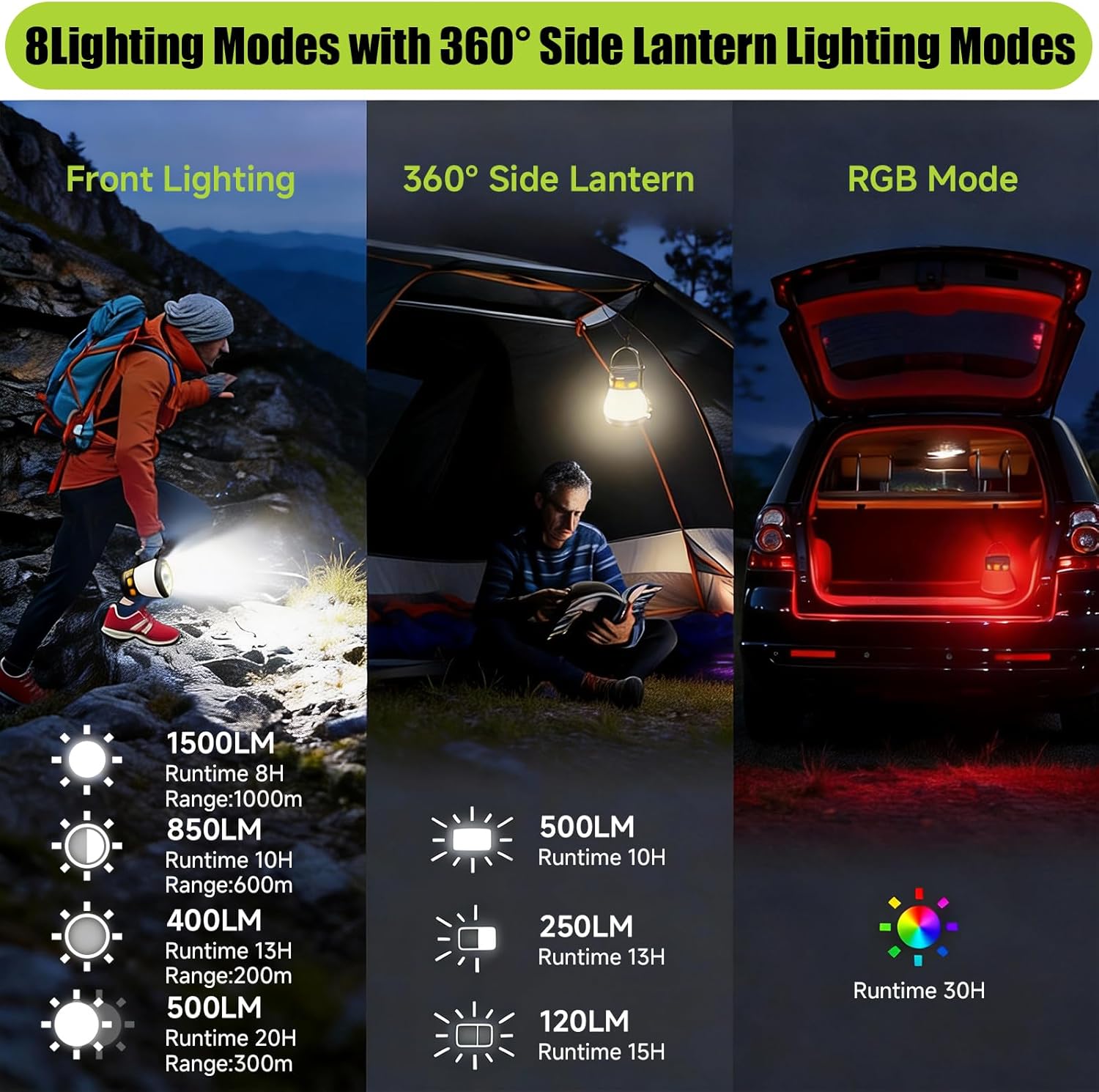 LED Camping Lantern, 1500 Lumens Camping Lantern Rechargeable with Solar Panel Charging, Waterproof, 8 Light Modes, 7500mAh Power Bank, Camping Flashlight for Hurricane Emergency, Hiking, Outdoor