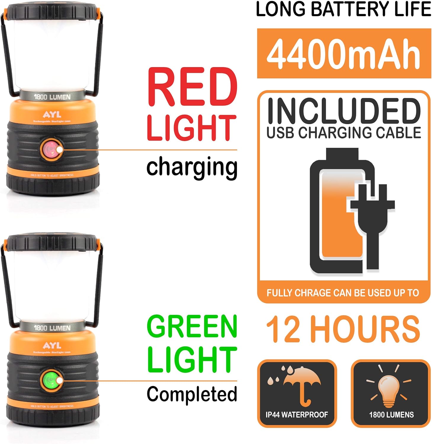 Additionally, the lantern is equipped with a 4400mAh power bank, enabling you to charge your devices on the go. It is also IP44 waterproof, ensuring durability in various weather conditions. This product comes with a USB cable for easy recharging.