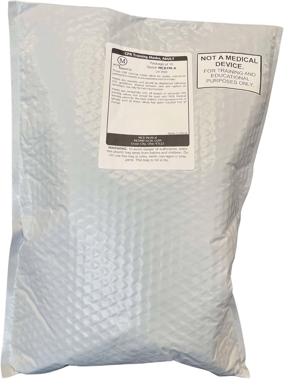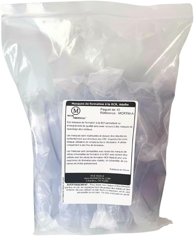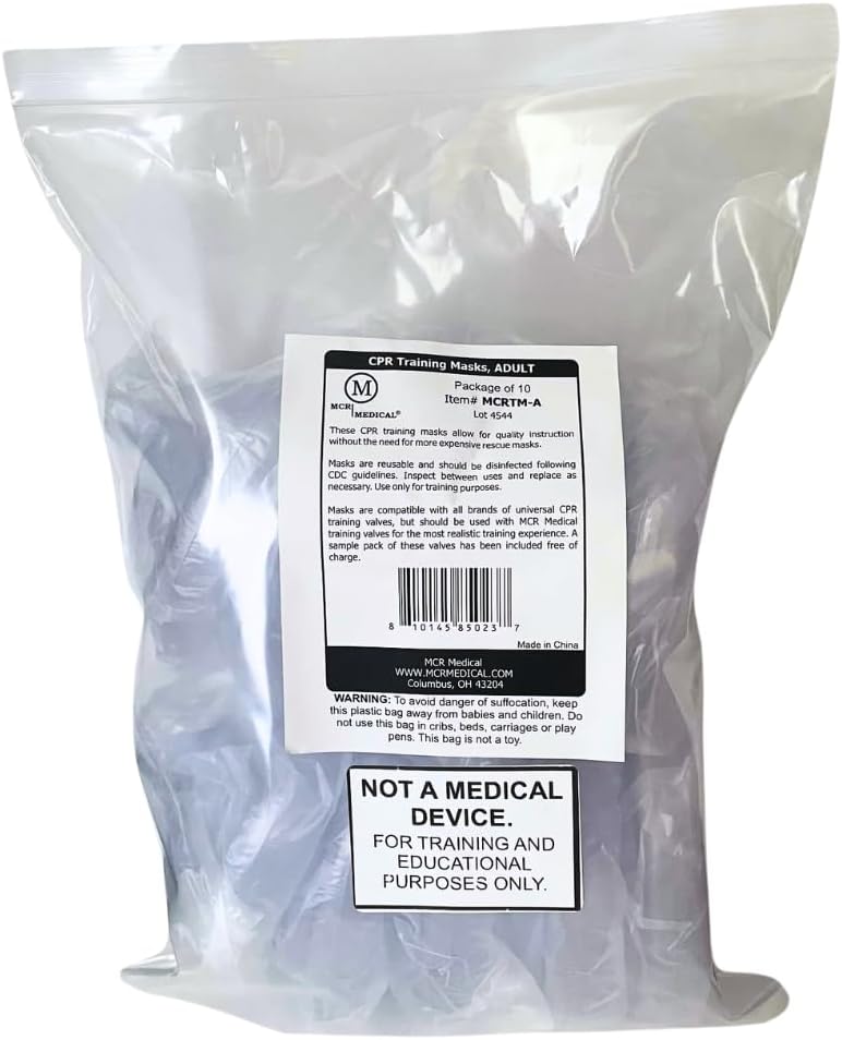 The MCR Medical Pack of 1 Training CPR Rescue Mask is designed for adult use and includes a valve for effective ventilation. This mask is an essential tool for CPR training and can be used in various educational settings. It helps ensure safety during practice sessions, allowing trainees to learn proper techniques without risk.