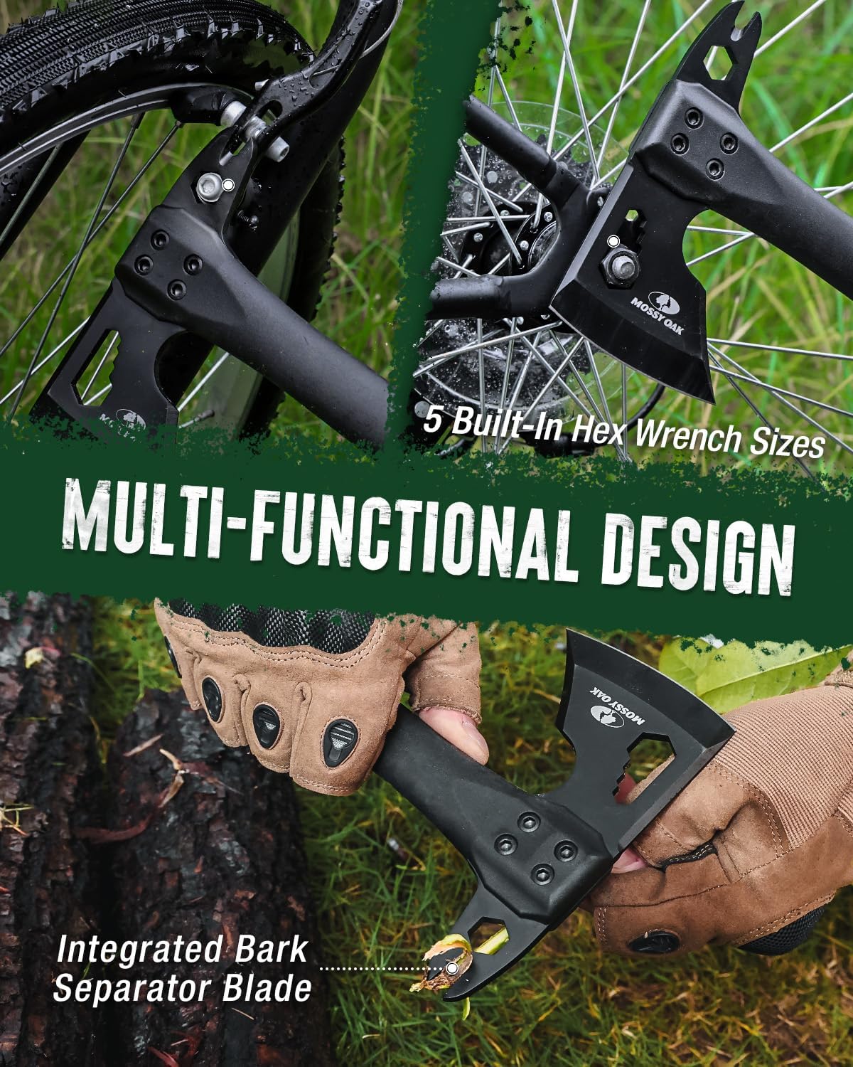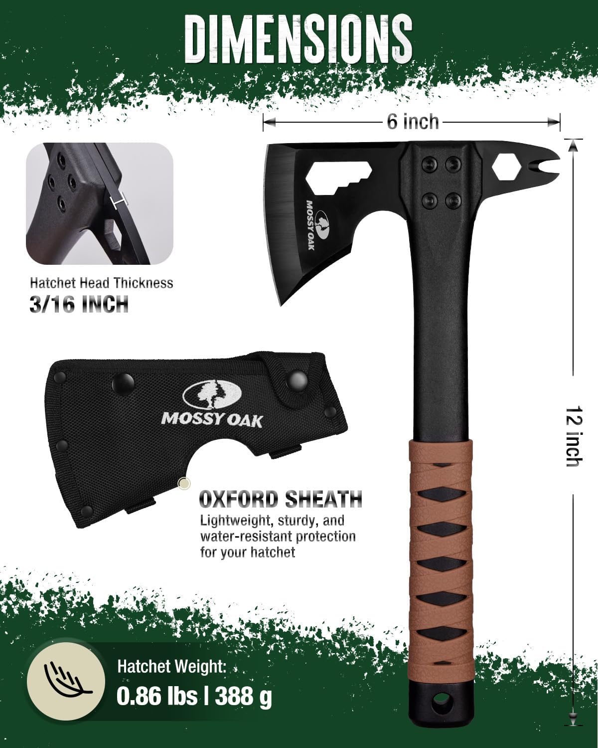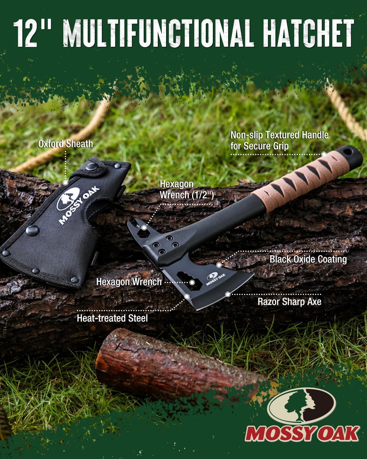 MOSSY OAK 12″ Camping Axe and Survival Hatchet with Sheath, Compact Outdoor Multitool Hatchet with Hex Wrench Slots, Non-Slip Dual-Color Handle, Small Camping Gear for Hiking, Chopping, Hunting