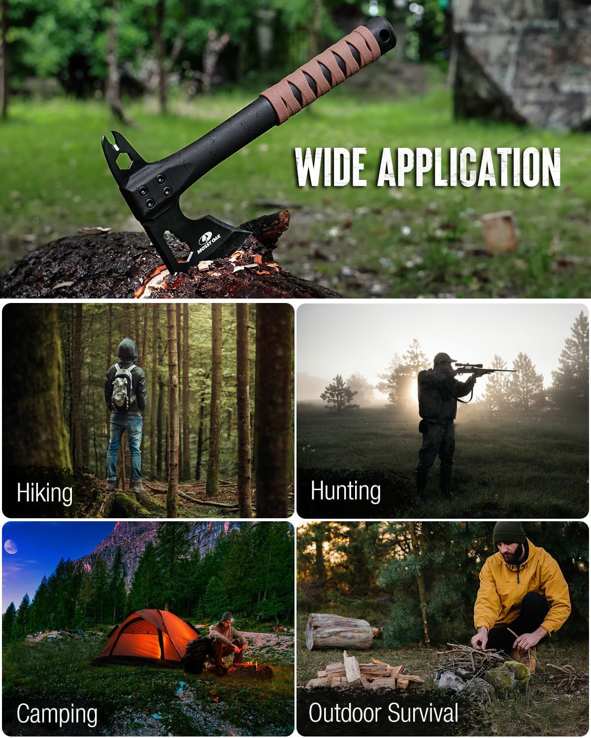 The MOSSY OAK 12" Camping Axe and Survival Hatchet is designed for outdoor enthusiasts who need a reliable tool for various tasks. This compact multitool hatchet features a non-slip dual-color handle, providing a secure grip during use. It comes with a protective sheath for safe storage and transport. The axe includes hex wrench slots, adding versatility for camping and hiking needs.