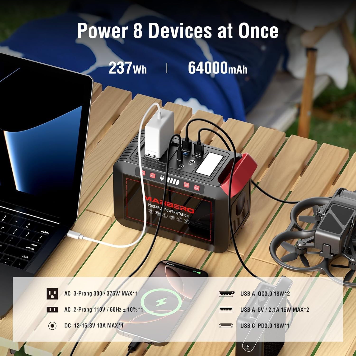 The Portable Power Station 300W MARBERO is an ideal companion for outdoor adventures, providing reliable energy for your devices. With a capacity of 237Wh, it features a pure sine wave 110V AC outlet, USB C, USB A, and DC outputs, making it versatile for various uses. Whether you're camping, using a CPAP machine, or preparing for a blackout, this generator ensures you have the power you need.