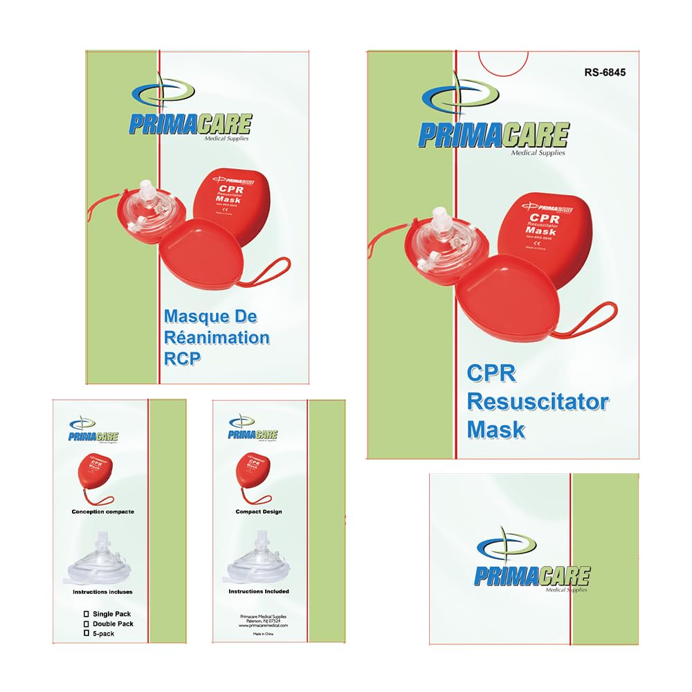 Primacare RS-6845-5 Pack of 5 Single Valve CPR Rescue Mask in Red Hard Case, Adult/Child Pocket Resuscitator with Elastic Strap, Air Cushioned Edges, 6.5×4.8×1.6 inches