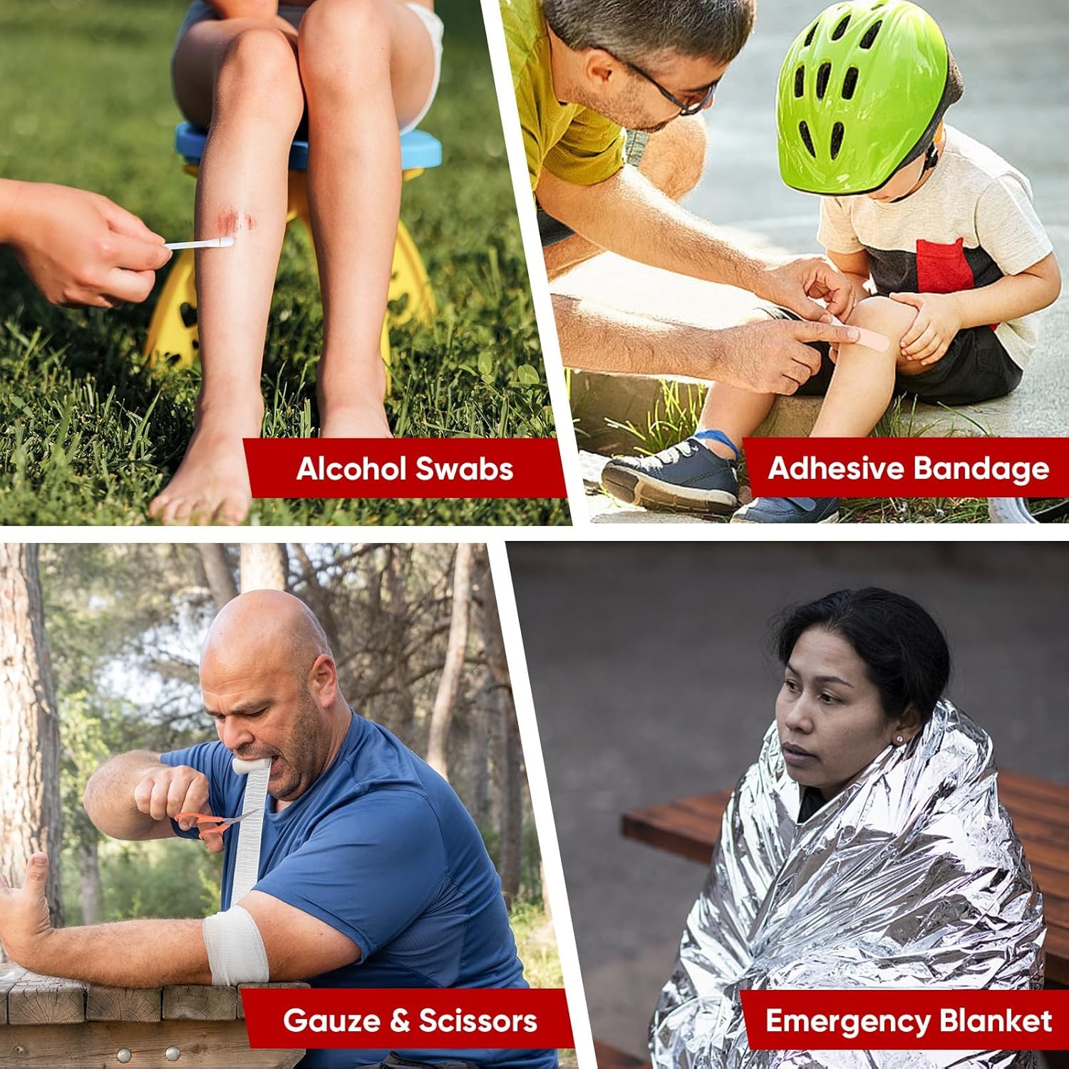 The kit includes a variety of first aid supplies such as bandages, antiseptic wipes, gauze pads, and more, totaling 150 pieces.