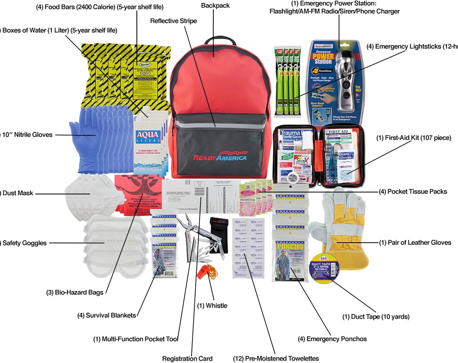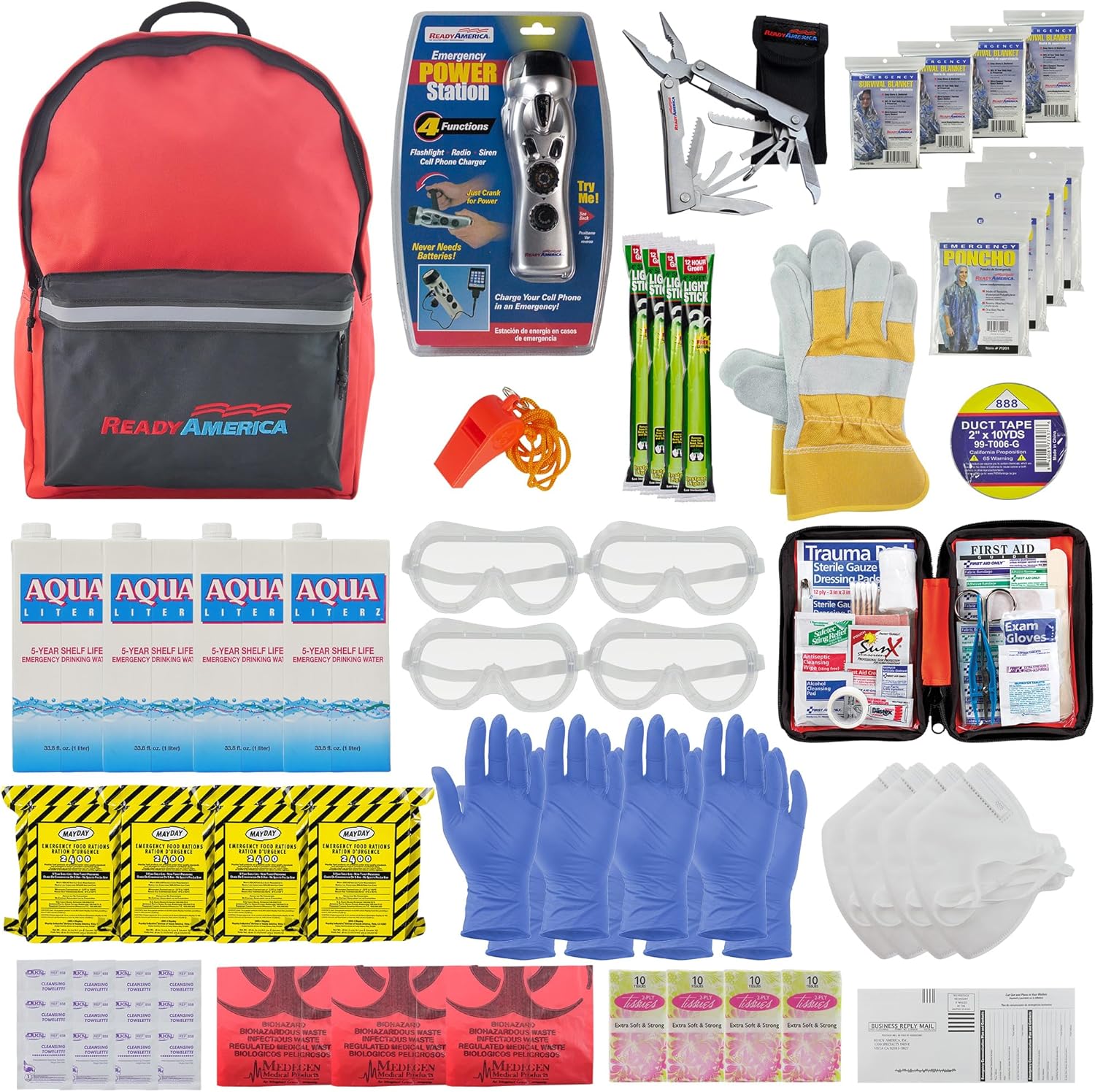 Ready America 72 Hour Deluxe Emergency Kit, 4-Person 3-Day Backpack, First Aid Kit, Survival Blanket, Power Station, Emergency Food, Portable Disaster Preparedness Go-Bag for Earthquake, Fire, Flood