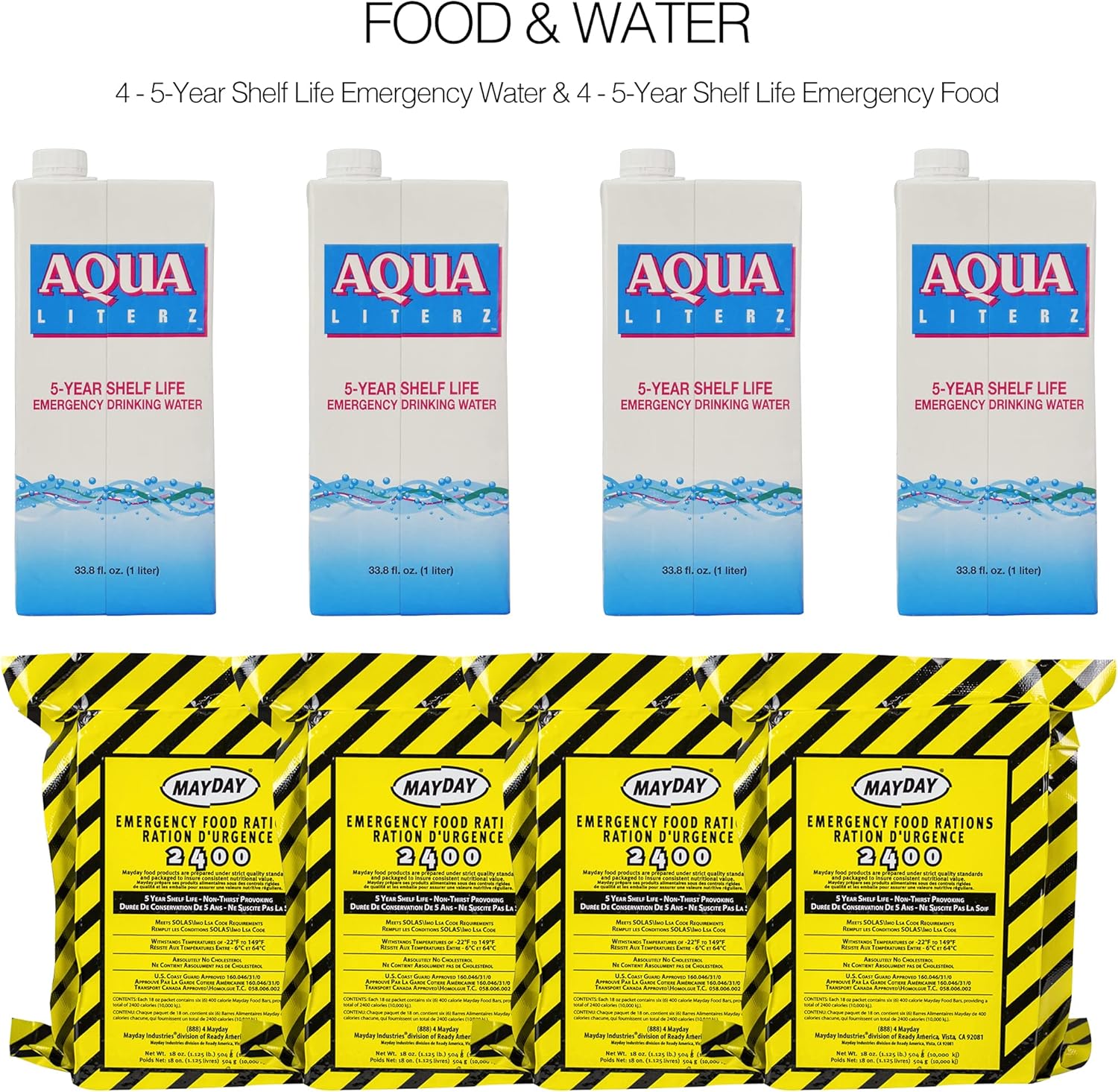 - U.S. Coast Guard approved food and water with a 5-year shelf life