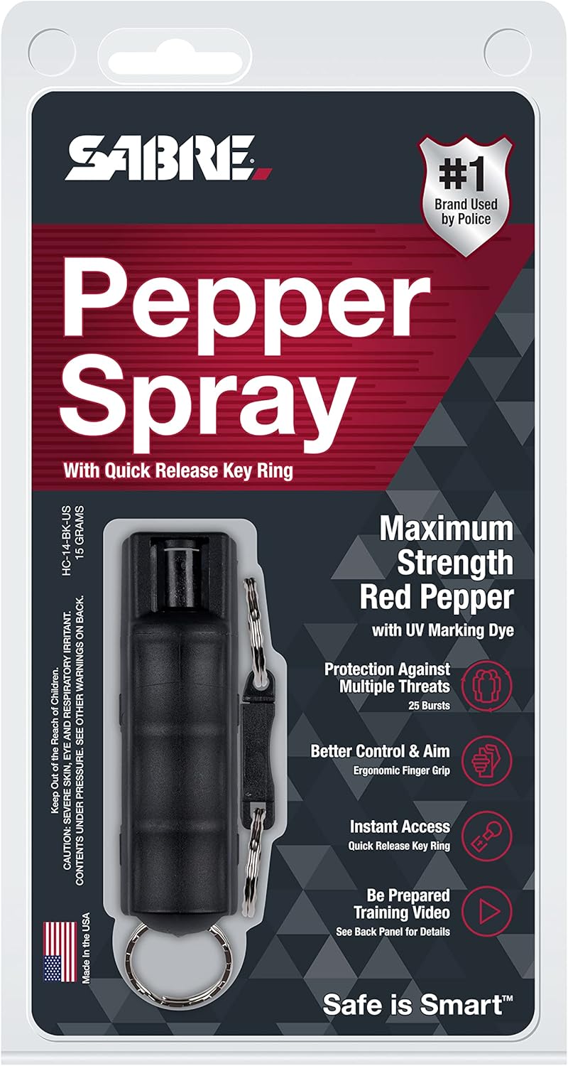 The SABRE Pepper Spray is designed for quick and easy access, making it a reliable self-defense tool. With a powerful spray time of 10 seconds and a range of 12-14 feet, it effectively targets potential threats while minimizing wind blowback. The finger grip ensures better aim, allowing you to focus on the situation at hand. Additionally, the Quick Release Keychain allows for immediate access, ensuring you are prepared when seconds count.