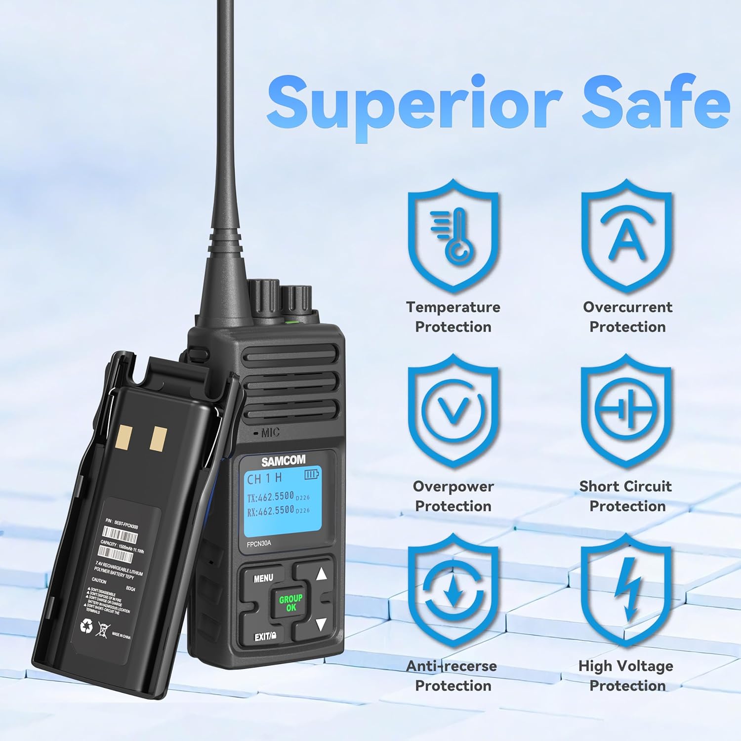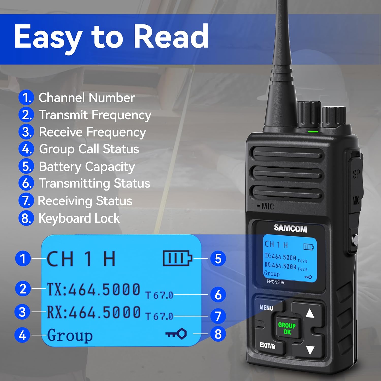 The SAMCOM Two Way Radio is designed for easy operation, making it suitable for various environments such as construction sites and schools. With a 5 Watt power output, it enhances both transmission and reception, allowing for long-distance communication. This set includes four radios, perfect for team coordination.