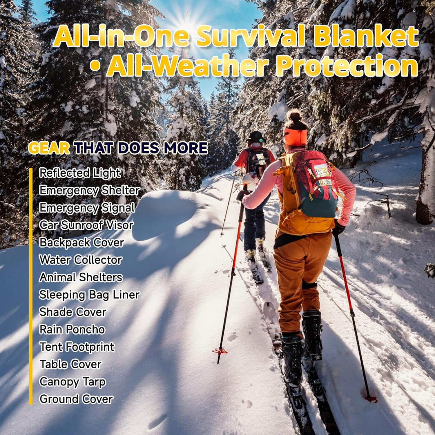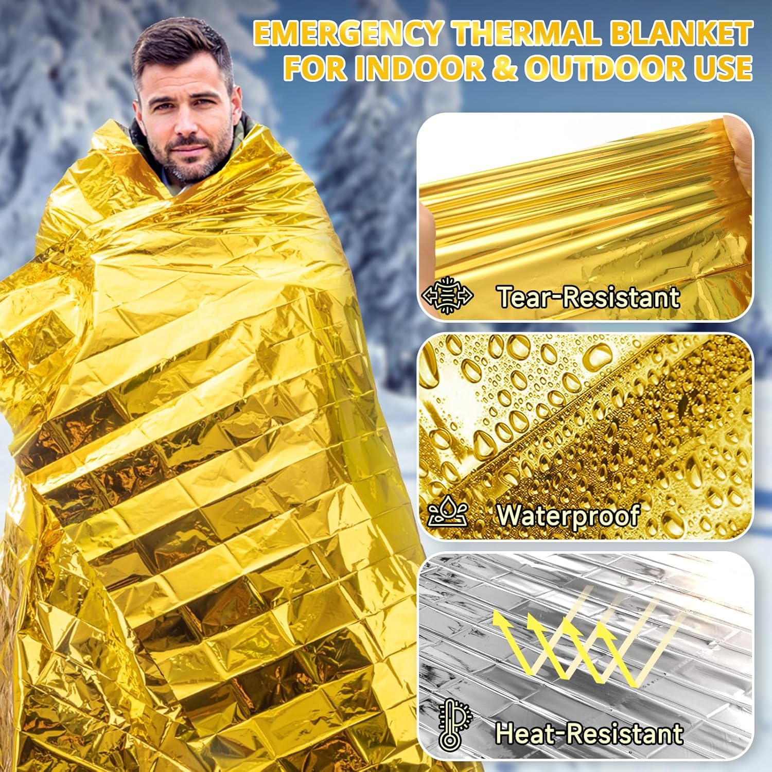 The SecuCaptain Survival Emergency Thermal Blankets are designed for outdoor use, providing essential protection in cold conditions. Each blanket measures an extra-large 84” x 63”, making them suitable for various activities such as camping, hiking, or keeping in your car for emergencies. This 4-pack of gold Mylar blankets is lightweight and compact, easily fitting into a bug-out bag or first aid kit.