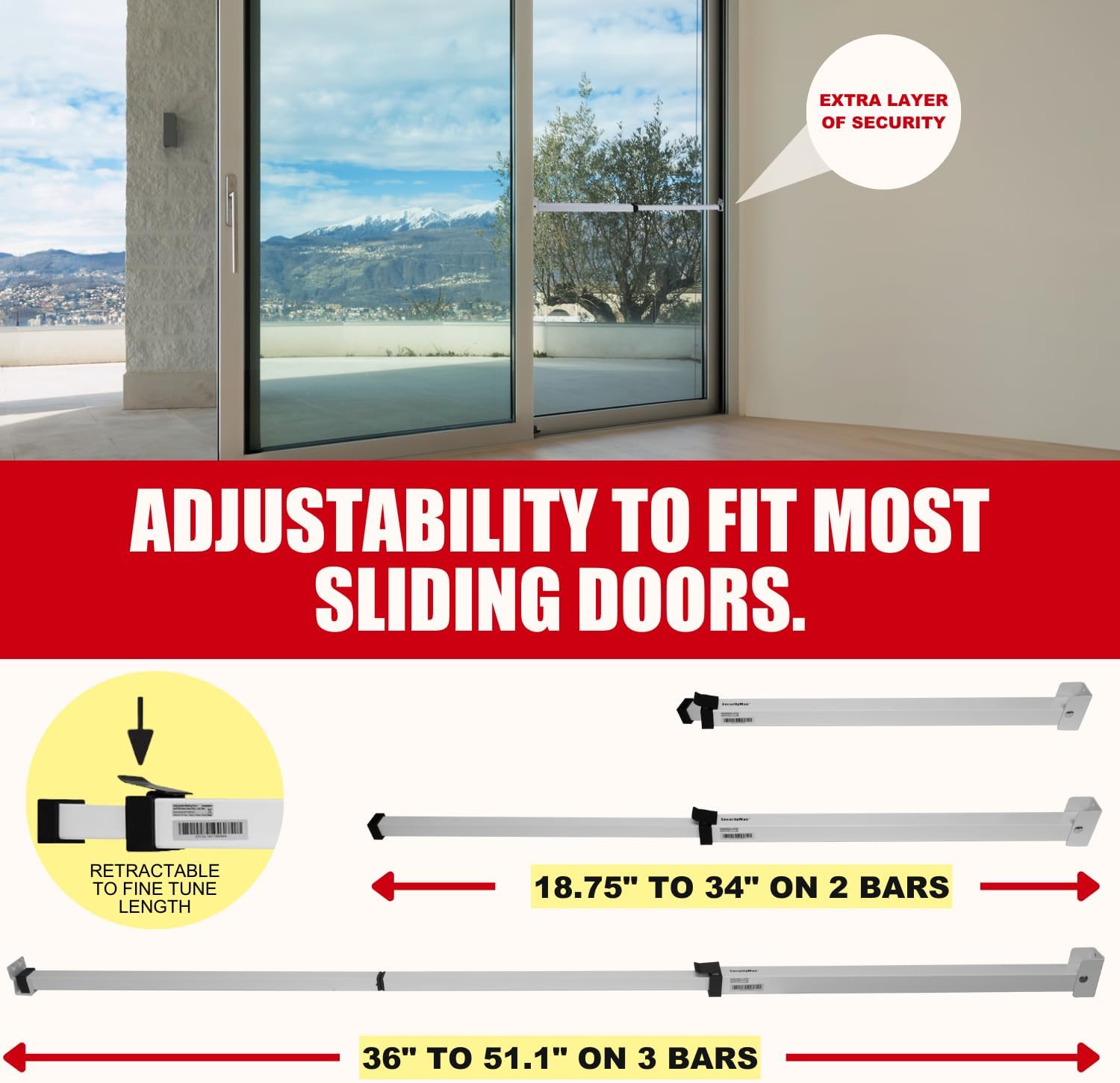 The SECURITYMAN Sliding Door Security Bar is adjustable and fits doors and windows with a length range of 18.75 inches to 51.1 inches.