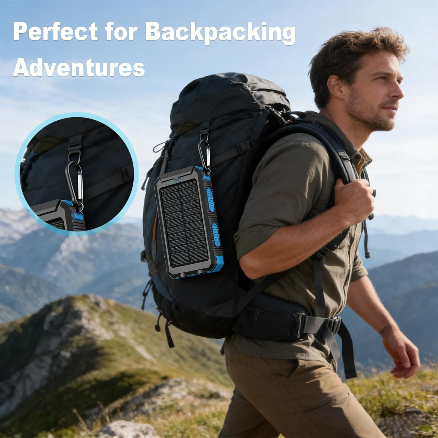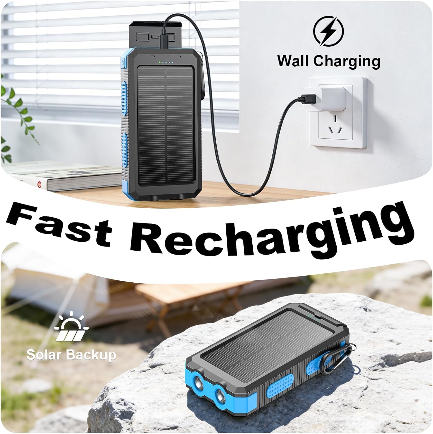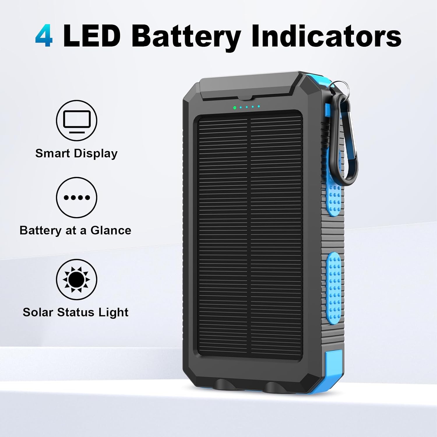 The Solar Charger Power Bank is designed for outdoor enthusiasts and emergency preparedness. With a capacity of 20000mAh, it provides ample power for multiple devices. This portable charger features four built-in cables and a USB-C in/output, making it versatile for various charging needs. Additionally, it is equipped with dual emergency flashlights, ensuring visibility during nighttime activities or emergencies. The waterproof design adds to its durability, making it suitable for camping, hiking, and travel.