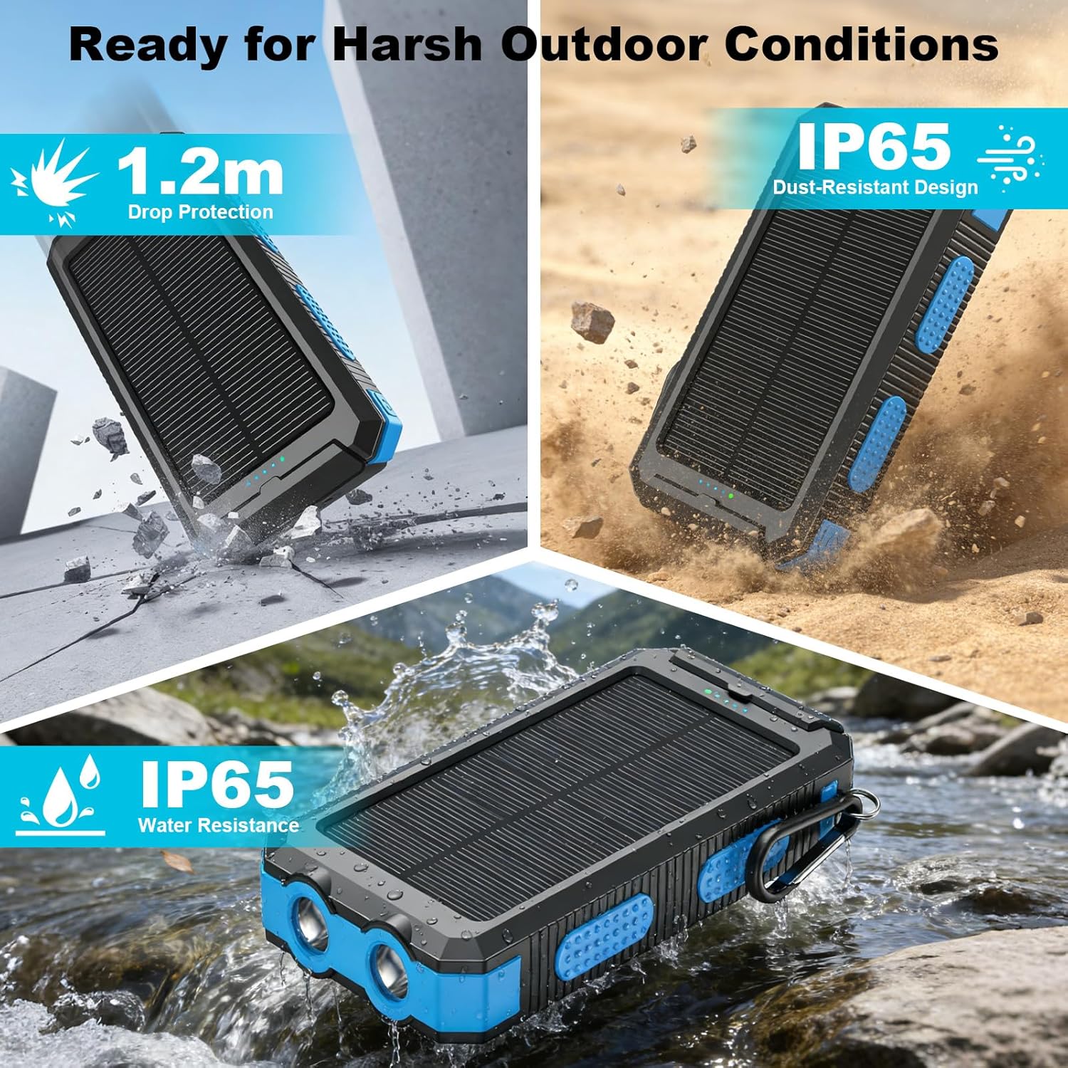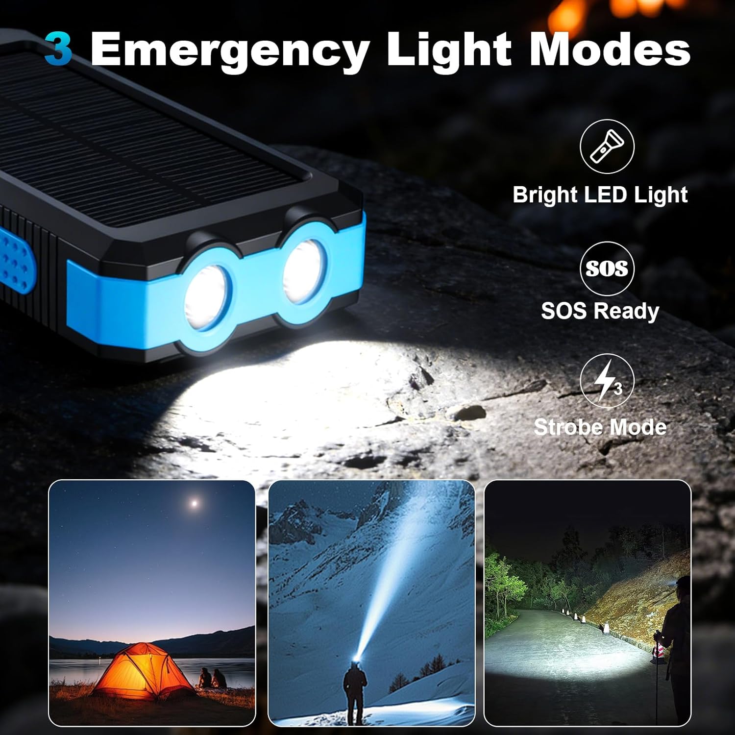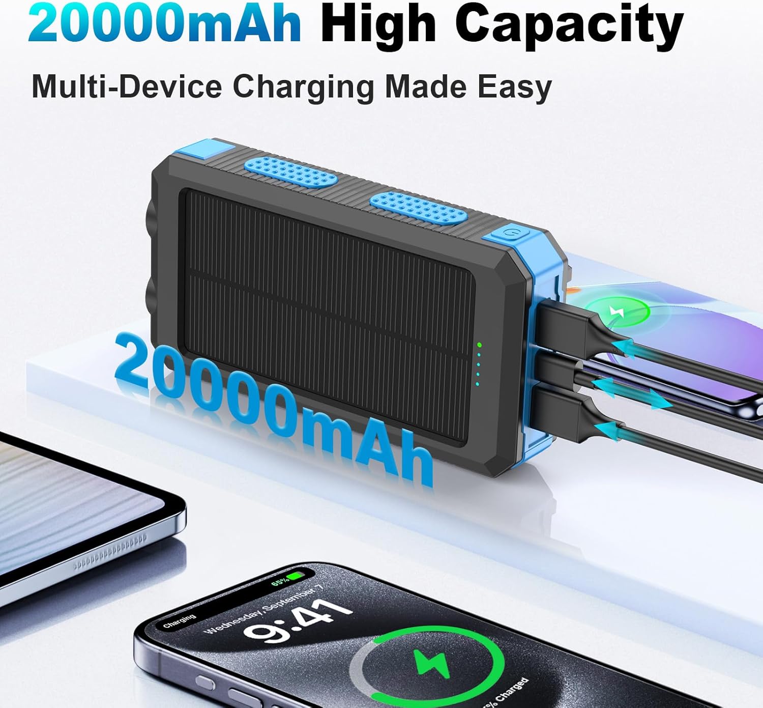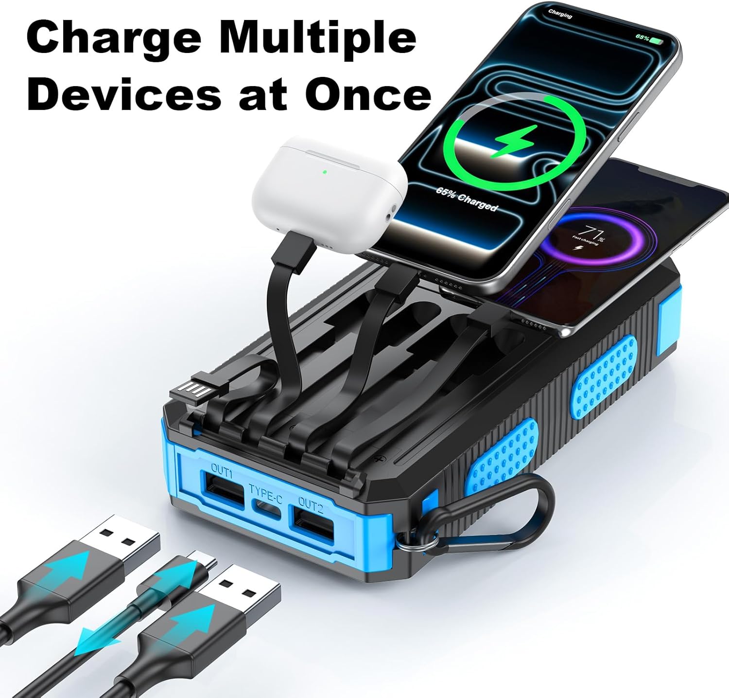 Solar Charger Power Bank 20000mAh Portable Charger with 4 Built-in Cables and USB-C in/Output, Dual Emergency Flashlights, Waterproof Outdoor Battery Pack for Camping, Hiking, Travel, and Storm Prep