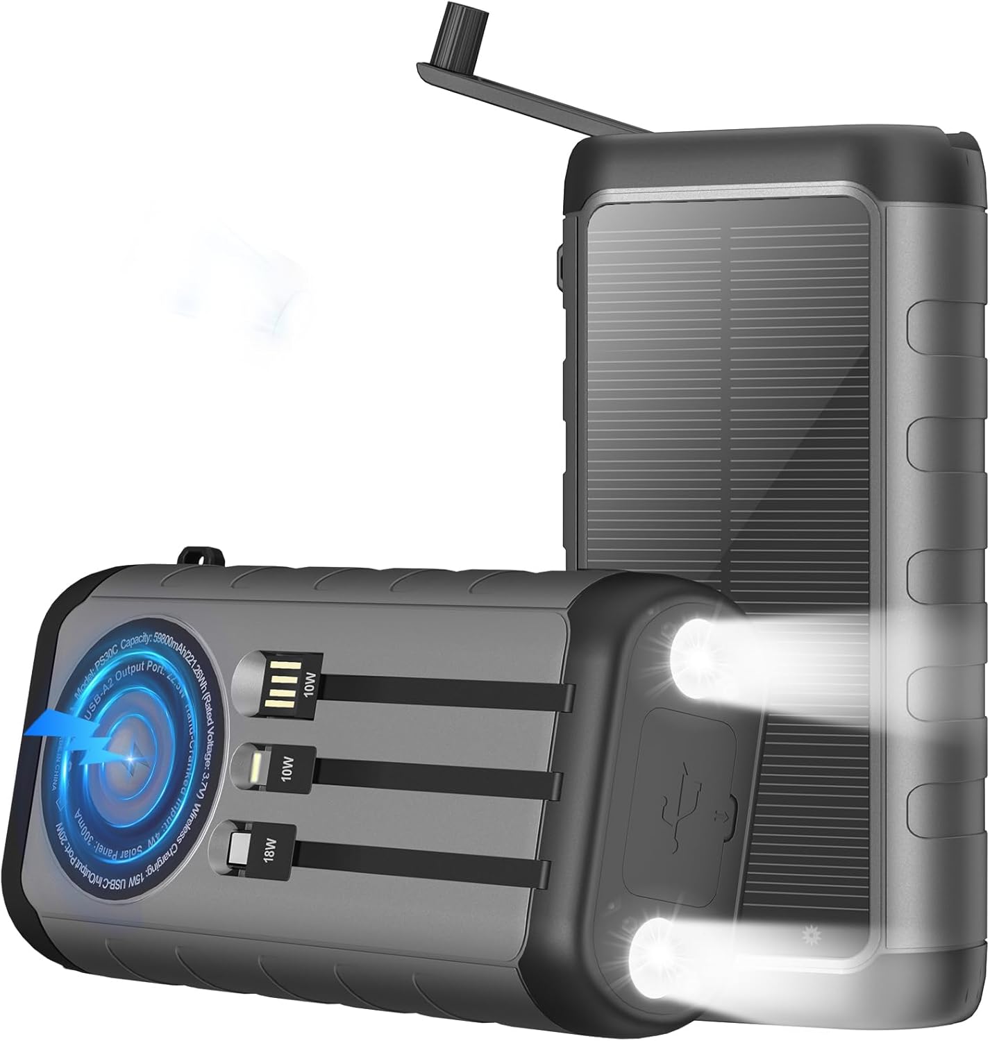 Solar Portable Charger Power Bank 59800mAh, Outdoor Waterproof Battery Pack, 3 Built in Cables & Hand Crank, 6 Outputs, 15W Wireless Charging, Emergency LED Flashlight for Camping Hiking Travel