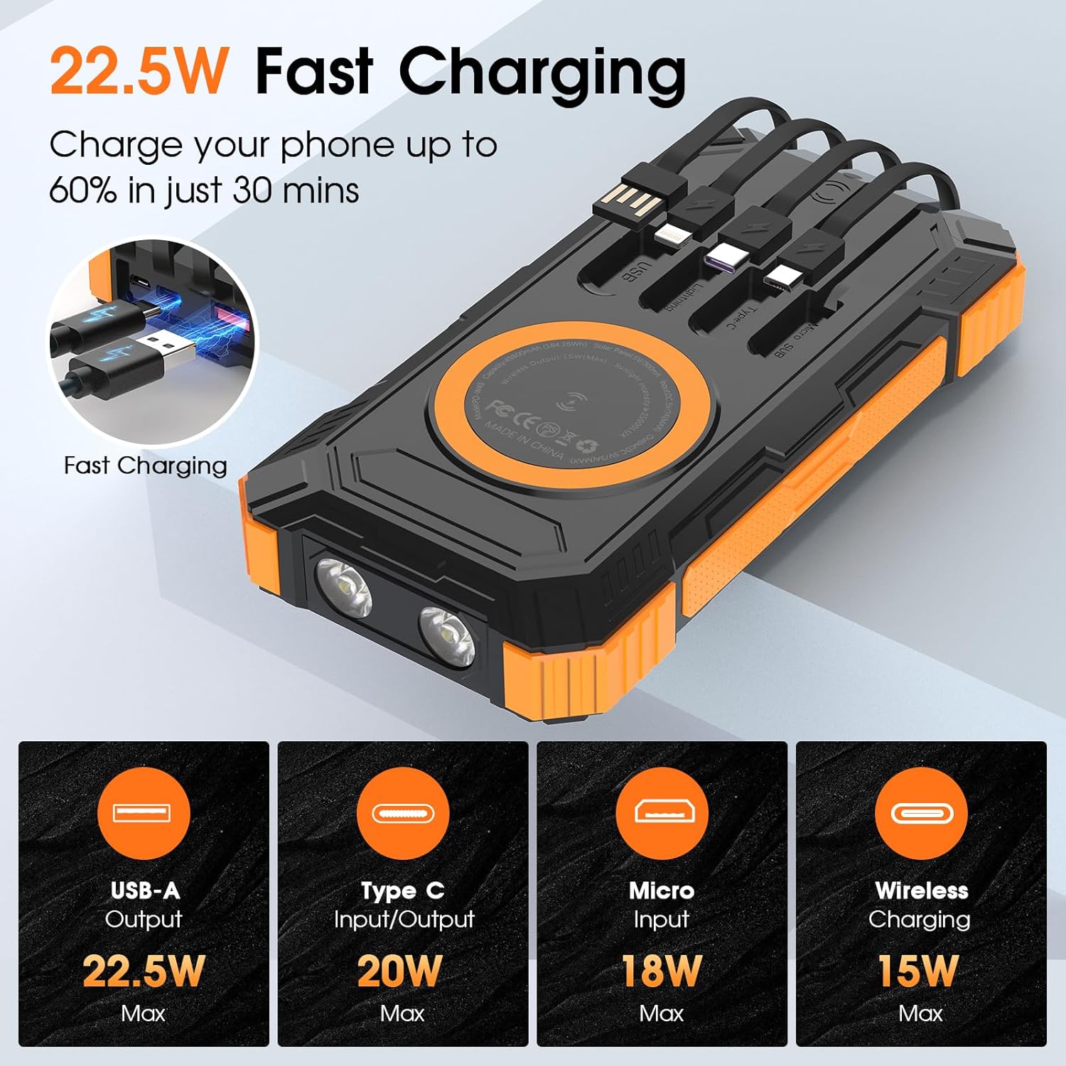 Solar Power Bank,49800mAh Wireless Portable Phone Charger with Built-in 4 Cables,22.5W Fast Charging External Battery Pack PD 3.0 USB-C In/Output for iPhone,iPad,Android,Perfect for Camping, Hiking