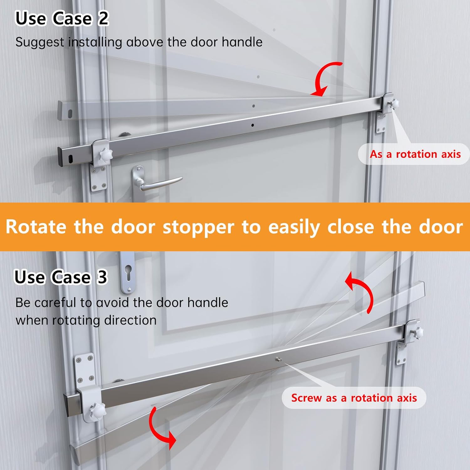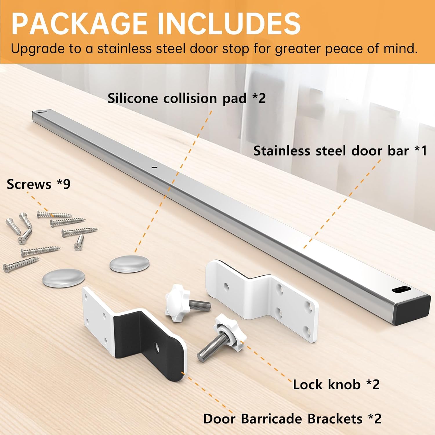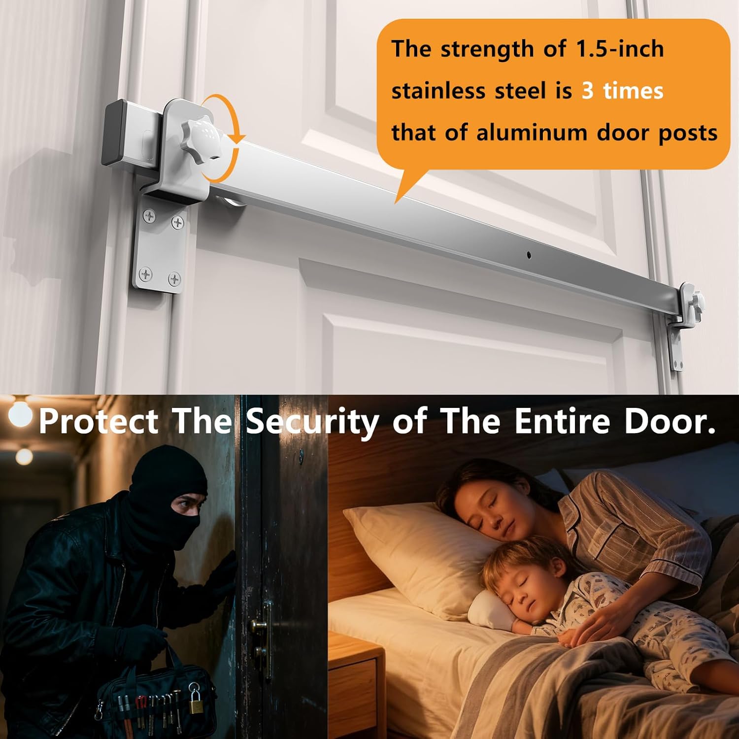 The Stainless Steel Door Security Bar is designed to enhance the security of your home. This door barricade measures 38 inches and fits doors that are 33 to 36 inches wide. It provides a reliable method to prevent unauthorized entry from the outside. The installation is straightforward, allowing you to set it up quickly from the inside. This product is ideal for enhancing the safety of your front door.