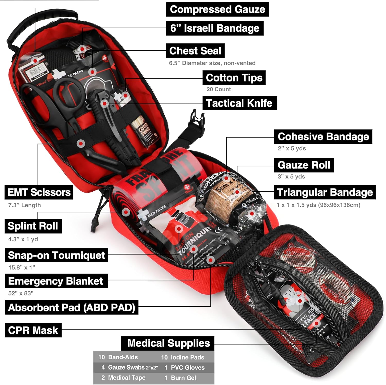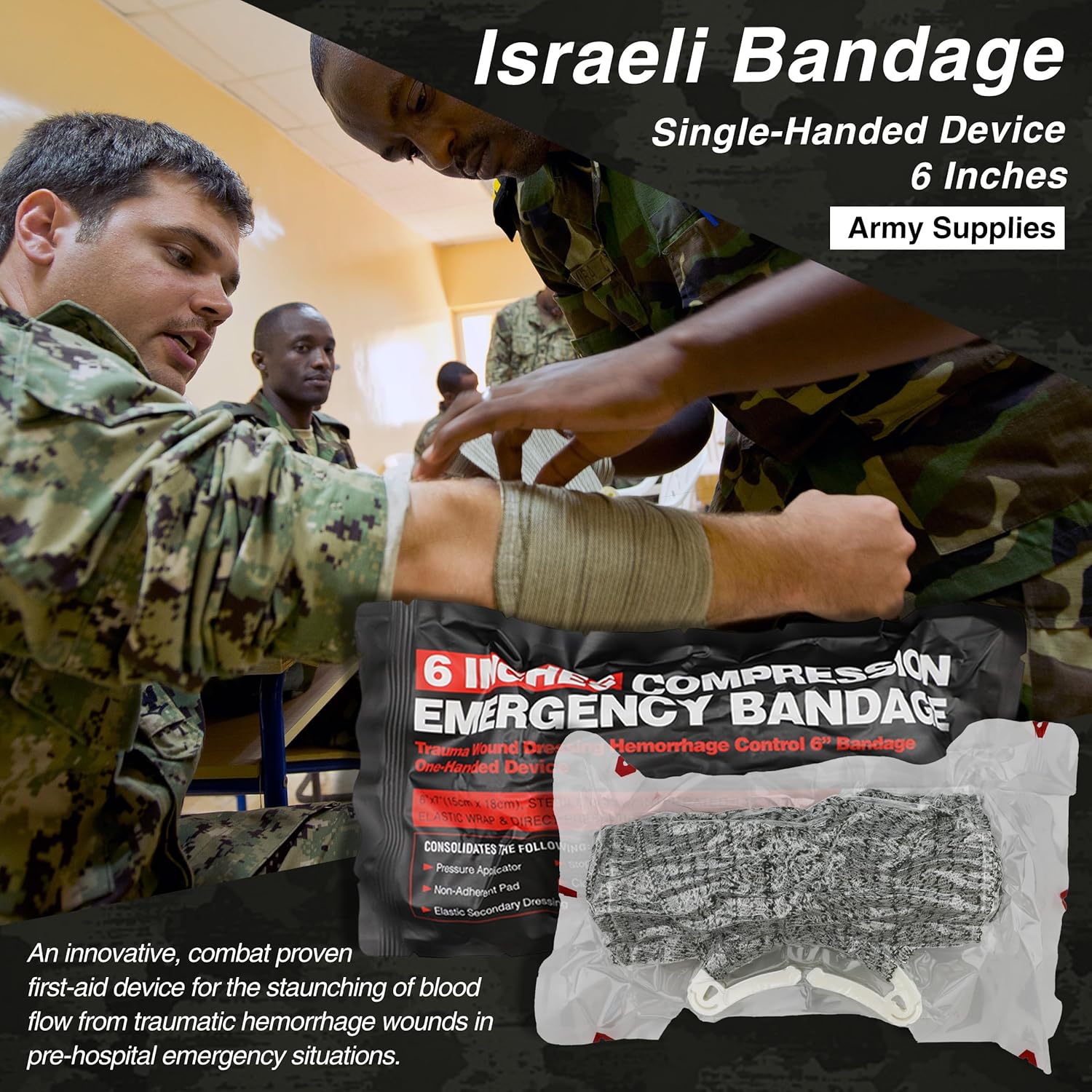 - Includes an Israeli bandage for quick and effective bleeding control.