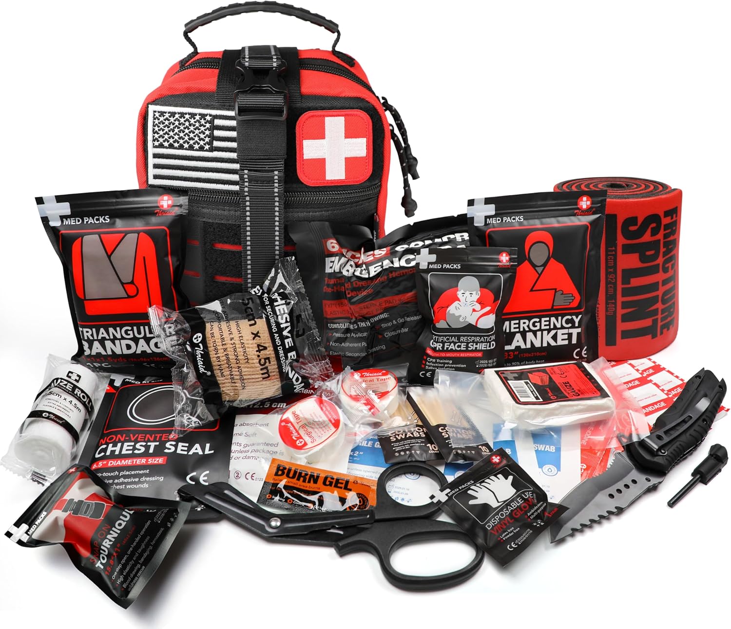 Survival First Aid Kit with Israeli Bandage, Chest Seal, Tourniquet, Splint, Tactical Military Combat Molle IFAK for Wound Care, Bleeding Control, Trauma Hemorrhage and More (Red)