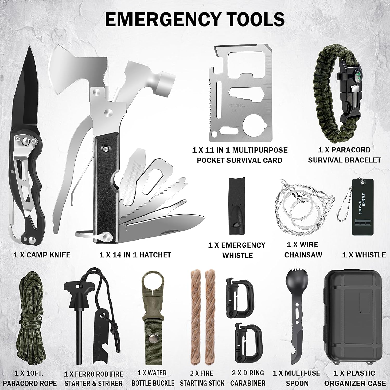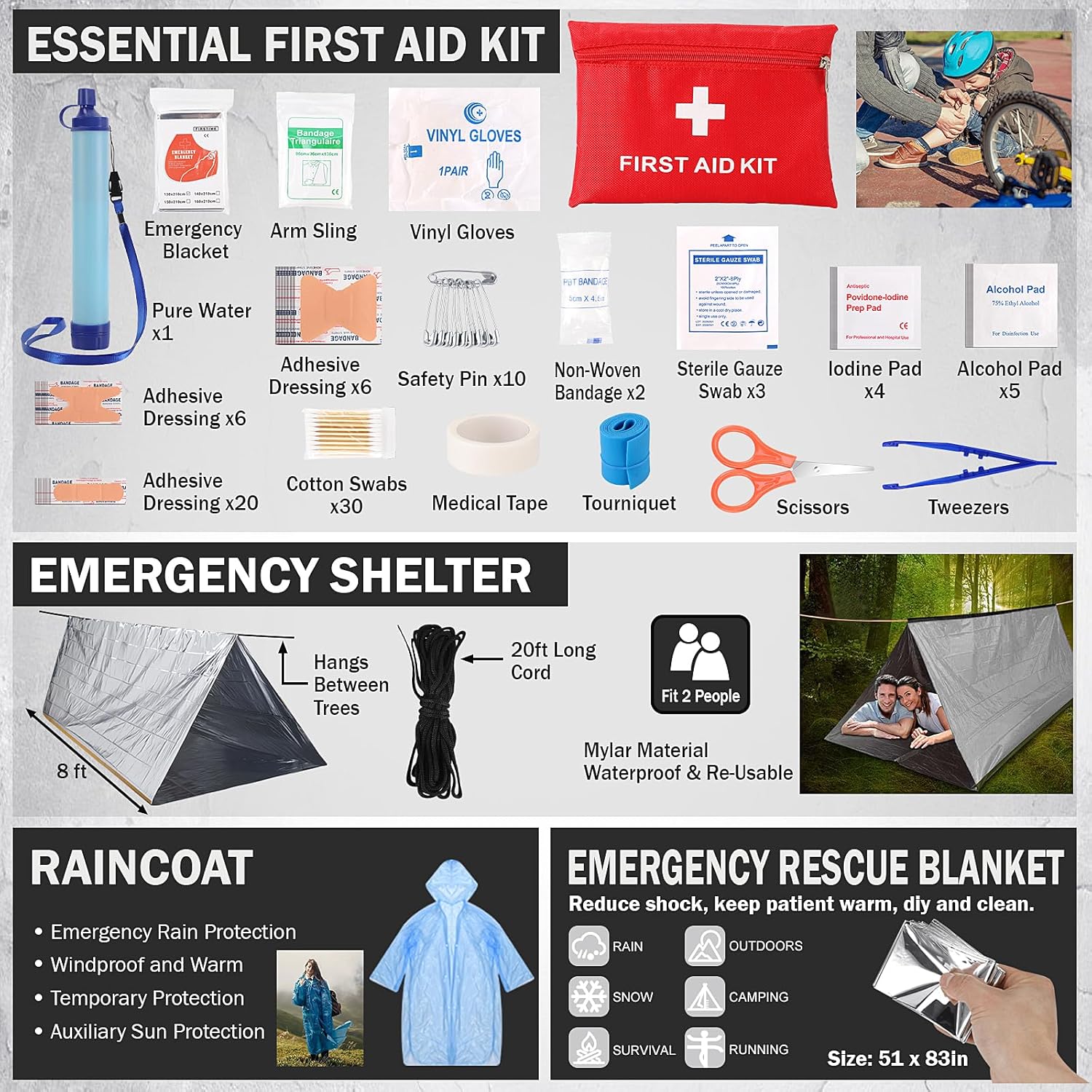 Survival Kit, Survival Gear and Equipment 258 PCS with Water Filter, Emergency Tent, LED Lantern, First Aid Kit Supplies, 25L Backpack for Family, Outdoor Camping, Hiking Gifts for Men Christmas