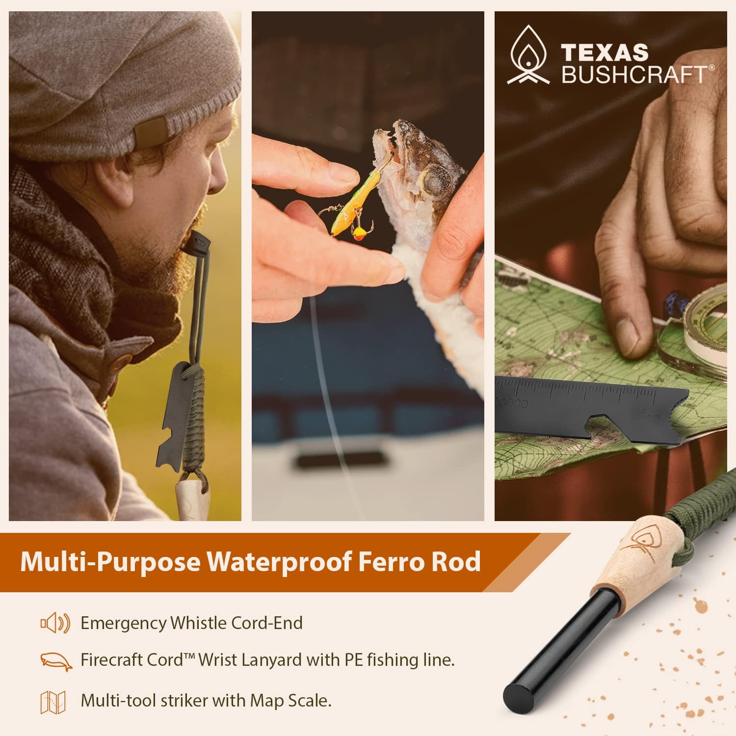 Texas Bushcraft Fire Starter – 3/8″ Thick Ferro Rod with Striker and Paracord Wrist Lanyard – Waterproof Flint Fire Steel Survival Lighter for Your Camping, Hiking and Backpacking Gear