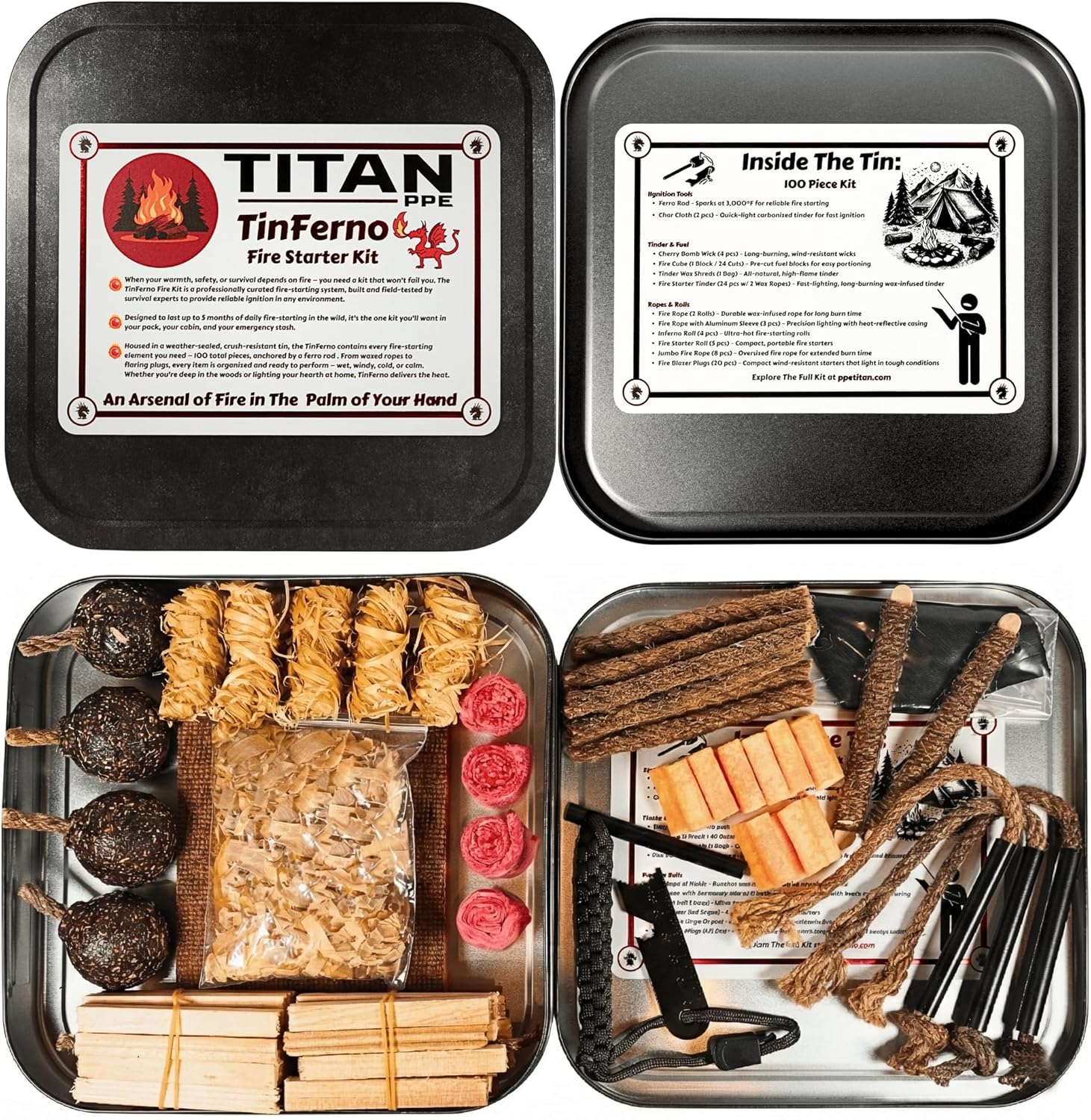 TinFerno Fire Starting Kit – 100pc Fire Starter for Campfires, Ferro Rod, Magnesium Flint, Char Cloth, Fatwood, Fire Kit, Hemp Wick, Camping, Bushcraft & Survival – Emergency Fire Starter Kit
