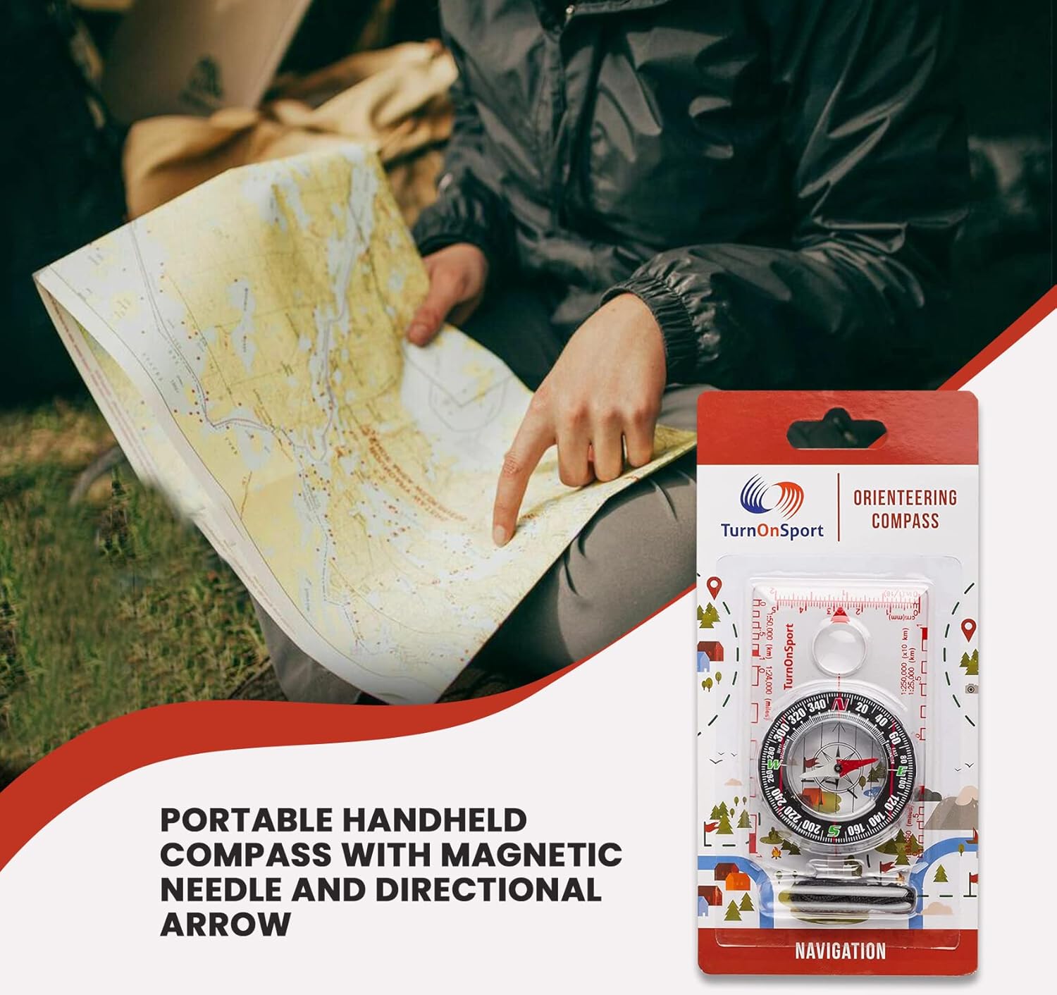 The TurnOnSport Orienteering Compass is a reliable navigational tool designed for outdoor enthusiasts. This compact compass features a high-speed precision magnetic needle, ensuring accurate direction finding. It includes horizontal orienteering lines and a scale map for effective navigation. The lightweight design makes it easy for beginners, such as cub scouts and eagle scouts, to use. With a 360-degree rotating bezel and a magnifier for geological maps, this compass is versatile for various outdoor activities.