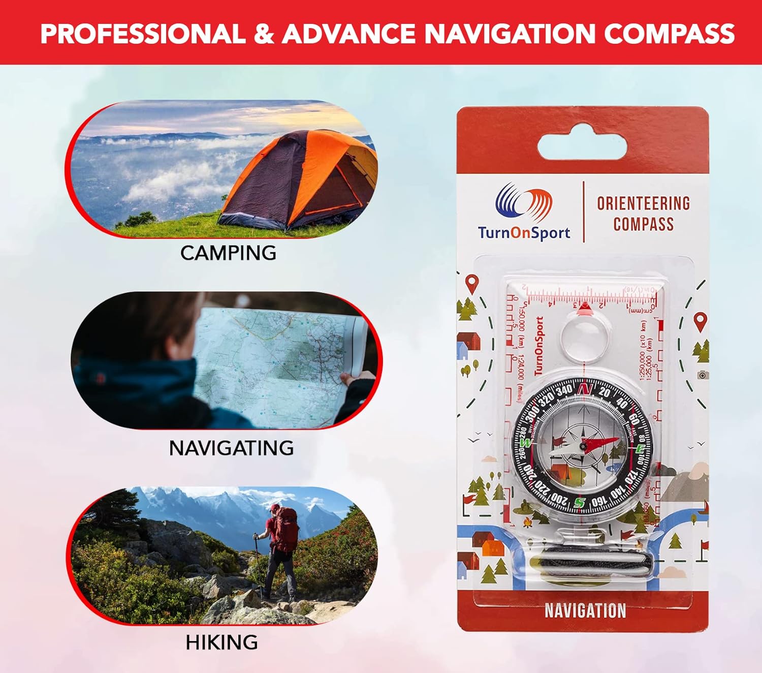 The TurnOnSport Orienteering Compass is designed for hiking, camping, backpacking, and other outdoor activities, serving as a basic navigational tool.